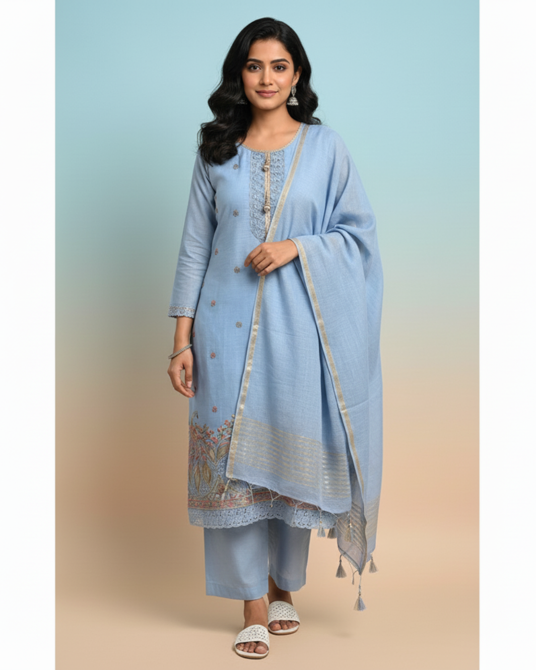 Powder Blue Pure Linen Semi-Stitched Suit with Hand Embroidery