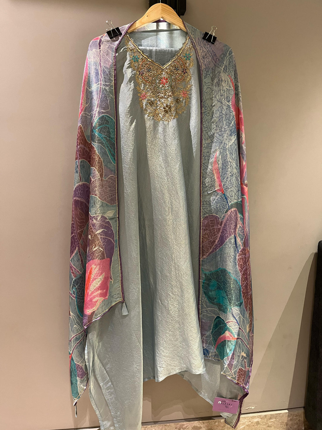 Bluish Grey Pure Crepe Semi-Stitched Suit with Printed Dupatta