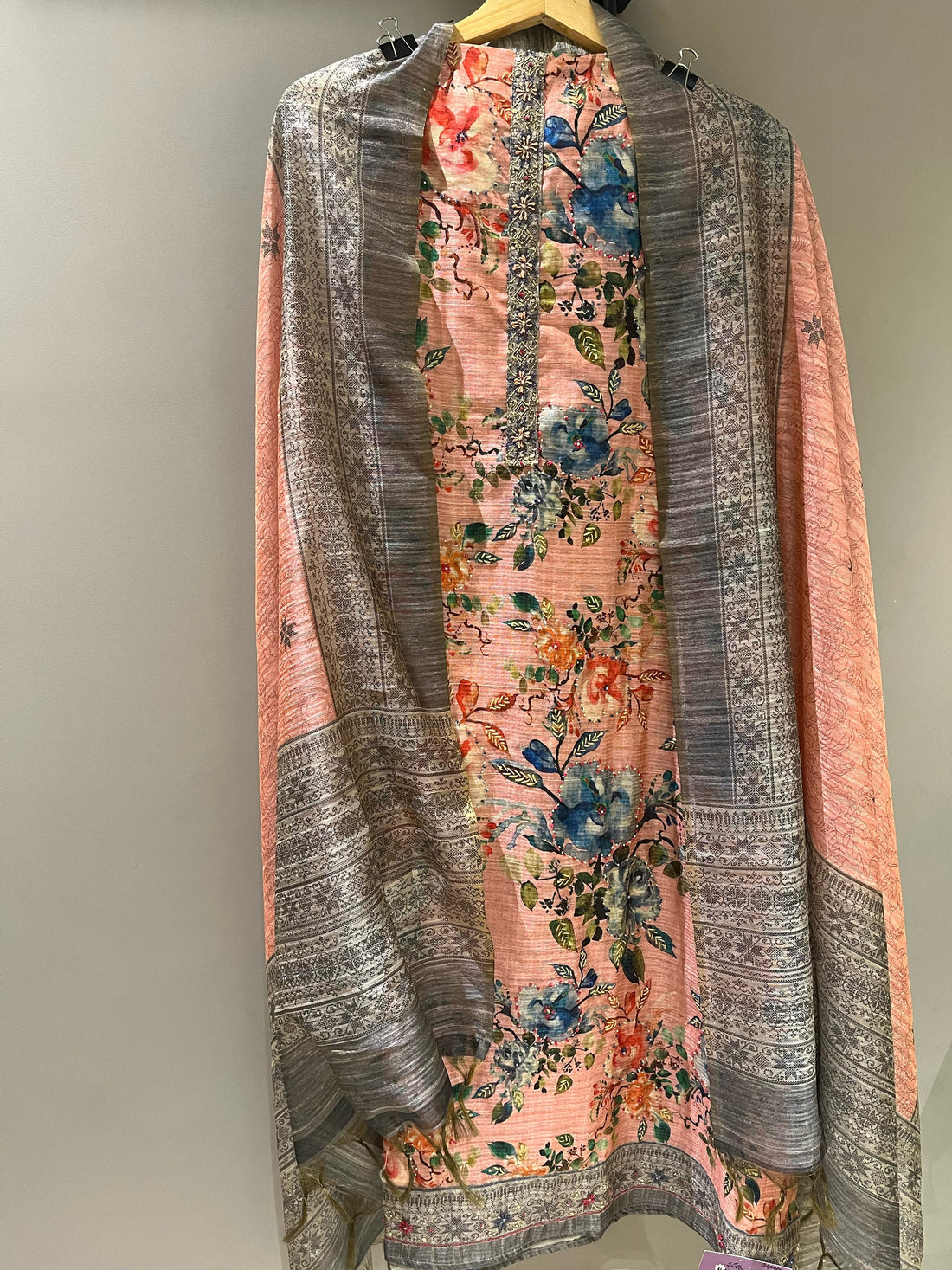 Violet Grey Pure Tussar Unstitched Suit with Handwork and Printed Dupatta