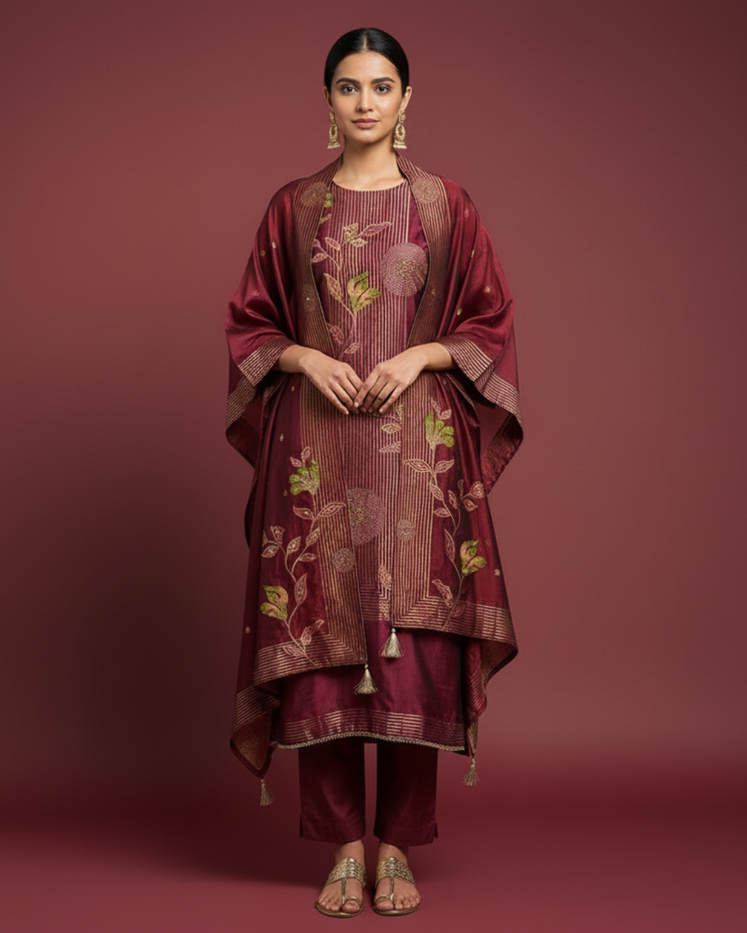 Maroon Pure Silk Unstitched Suit with Highlighted Shirt & Dupatta