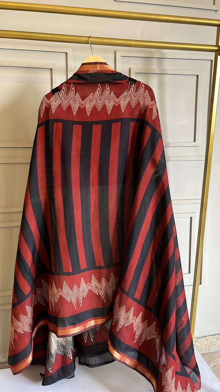 Beige, Black & Maroon Maheshwari Silk Unstitched Suit with Printed Details
