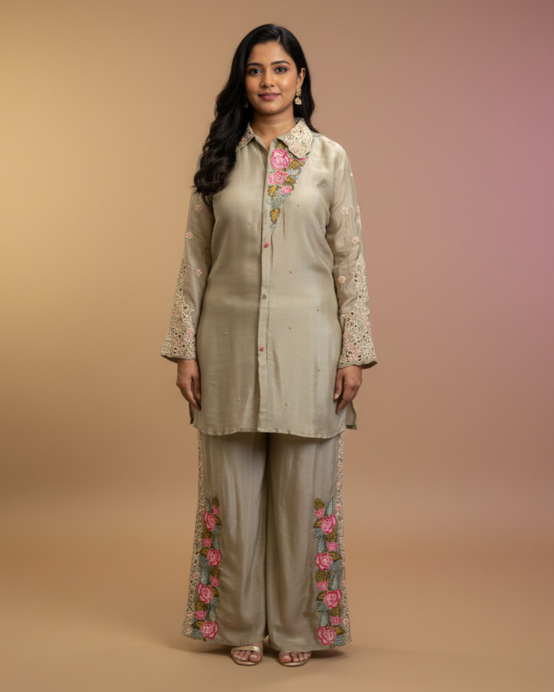 Radiate understated luxury with this Beige Golden Pure Chinnon Co-ord Set, designed for the modern woman who values grace and craftsmanship. The fine thread and pearl handwork add an elegant shimmer, beautifully complementing the soft, flowing chinnon fabric. Its refined silhouette offers a perfect balance of sophistication and comfort, making it an ideal choice for formal events, festive occasions, or elegant evening affairs.
