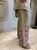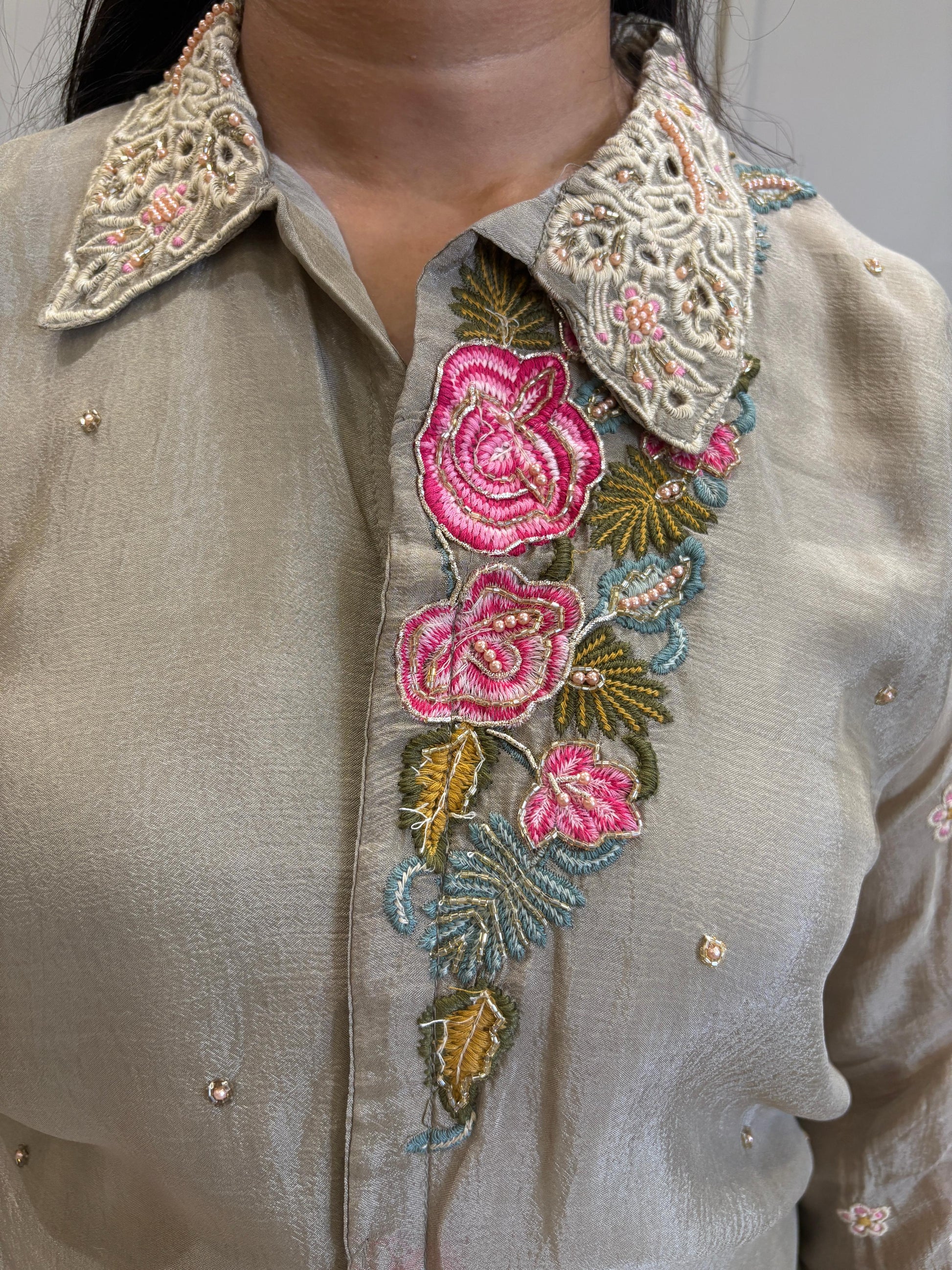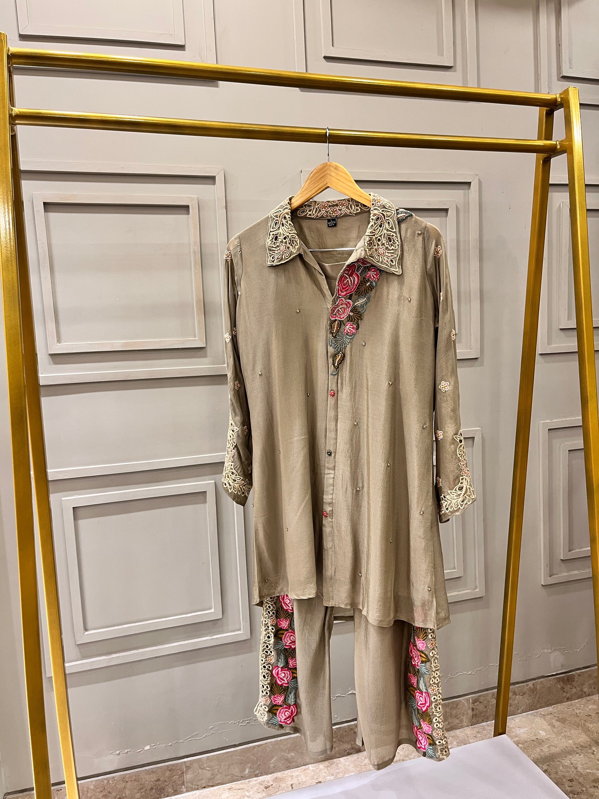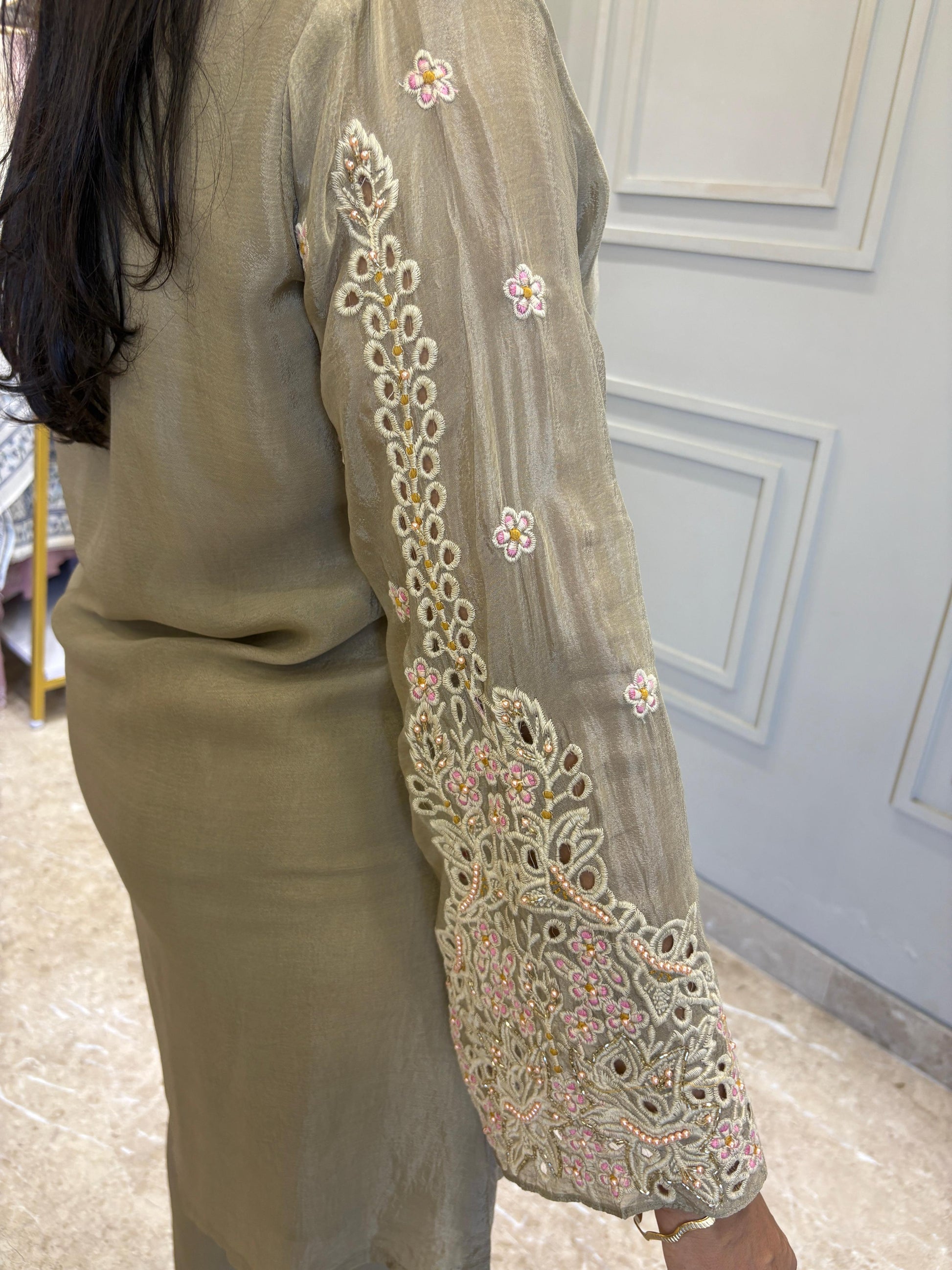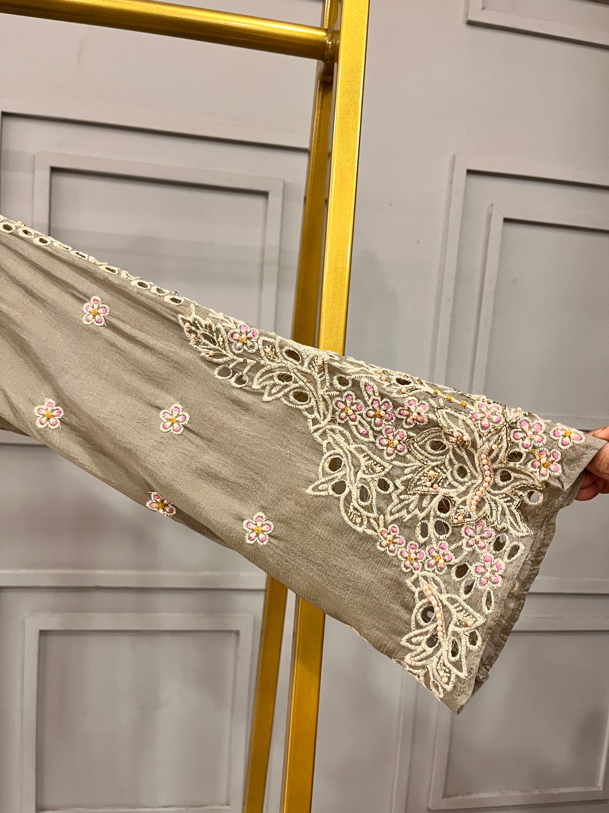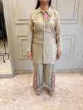 Beige Golden Pure Chinnon Co-ord Set with Thread & Pearl Handwork