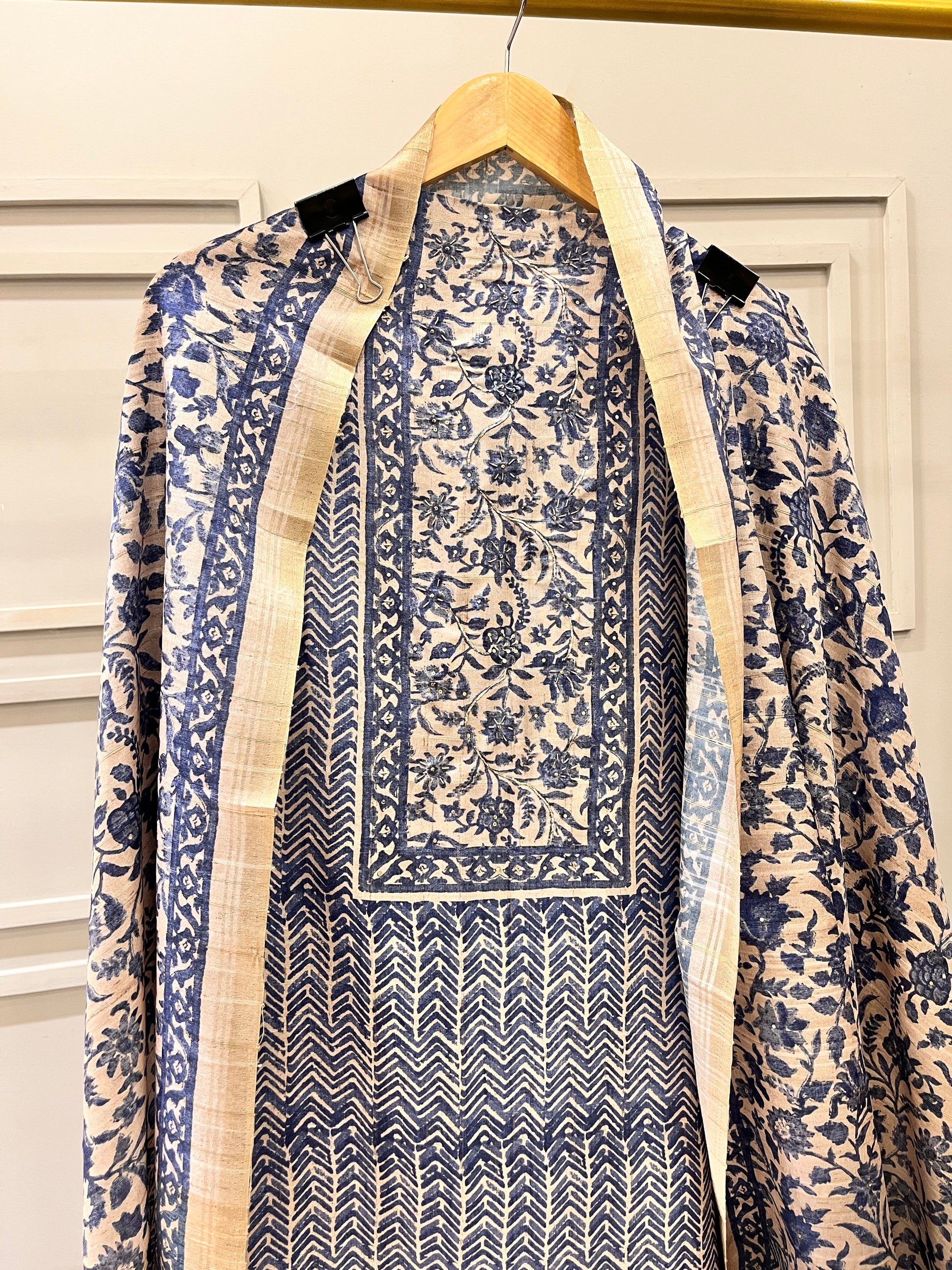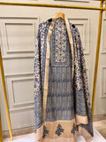 Refined and timeless, this blue and fawn pure tussar unstitched suit is a perfect blend of sophistication and traditional charm. The shirt features intricate work on the border and neckline, adding an elegant touch to its luxurious tussar texture. Paired with a fawn-coloured bottom and a pure tussar dupatta, this ensemble is ideal for festive gatherings, formal occasions, or graceful daywear.
