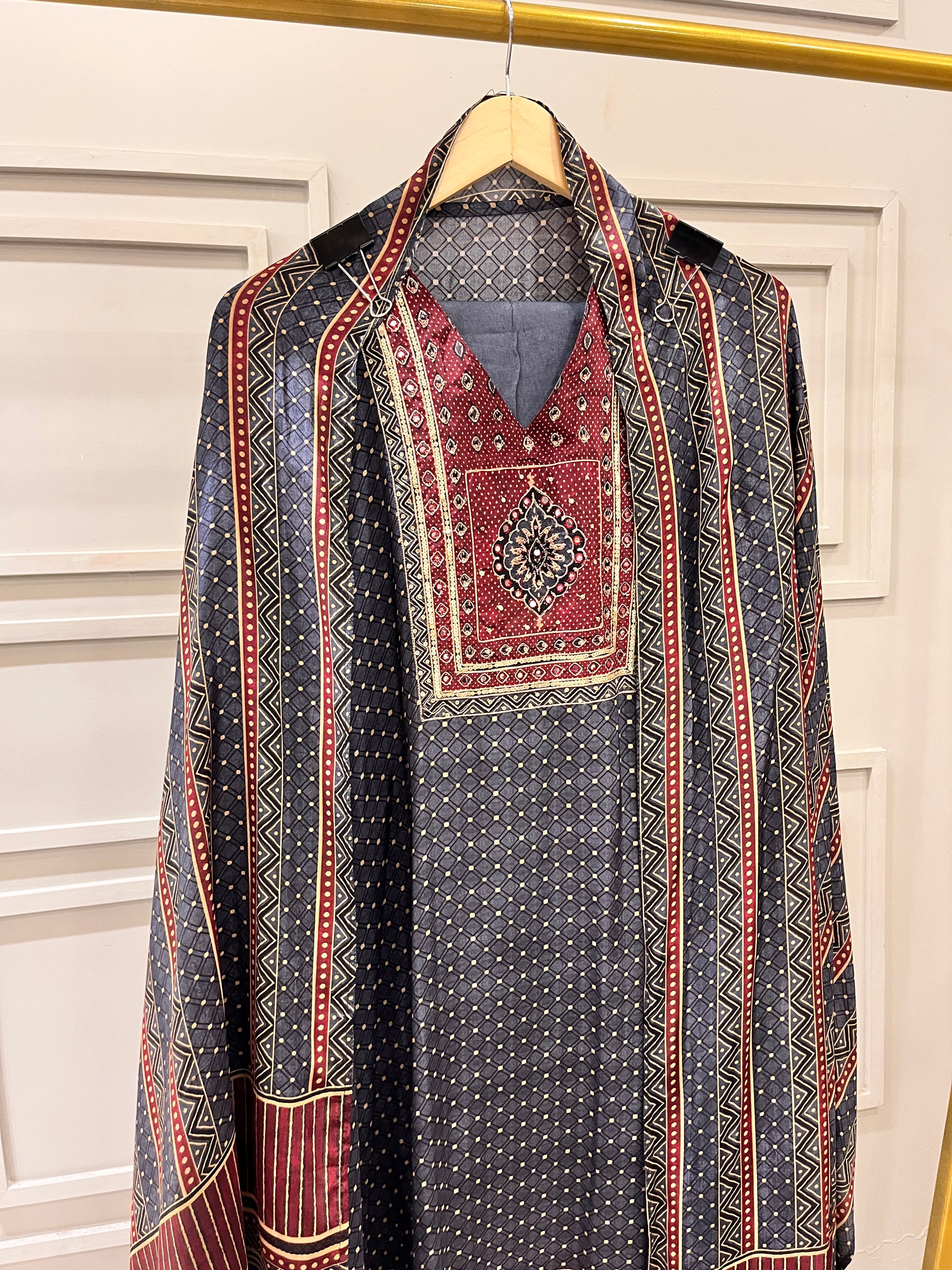 Elevate your wardrobe with this semi-stitched pure crepe suit in a sophisticated bluish grey shade. The soft, flowing fabric ensures comfort, while the printed dupatta adds a stylish touch. Paired with a plain lower in the same base color, this ensemble offers understated elegance for festive occasions, office events, or casual gatherings.