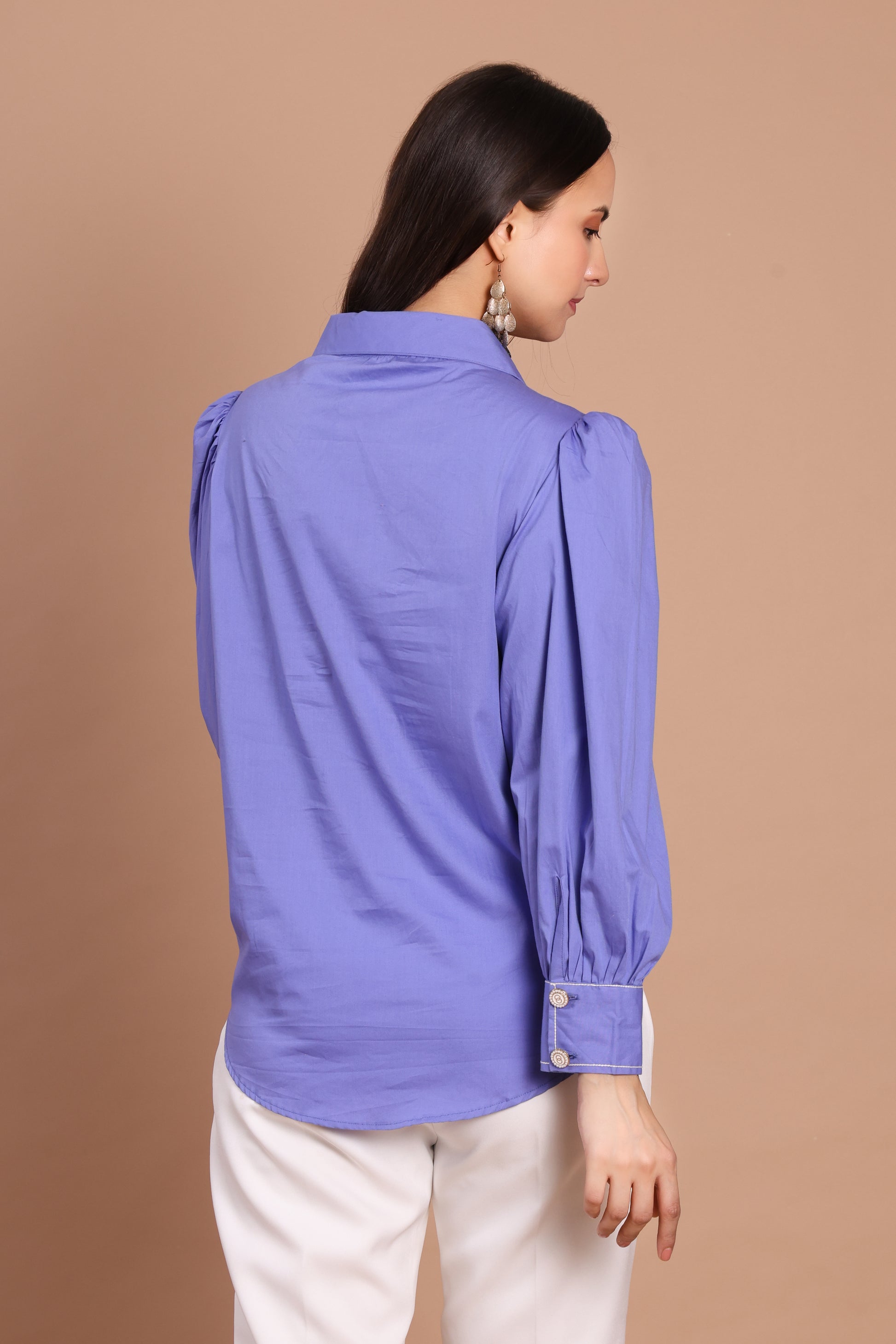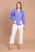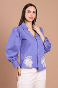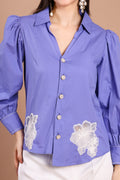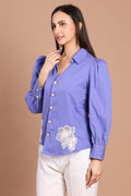 Elevate your wardrobe with this Bluish-Purple Hand-Embellished Shirt — a blend of bold color and refined detail. The rich violet hue is complemented by delicate white floral appliqué on the front, lending a touch of artistry and femininity. Puff sleeves add gentle volume and a contemporary edge, while the tailored cut ensures a flattering and polished finish. Pair it with sleek trousers or a skirt to make this shirt the focal point of your look.