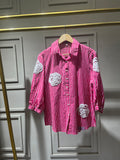 Pink Organic Cotton Striped Shirt with Floral Crochet Patches