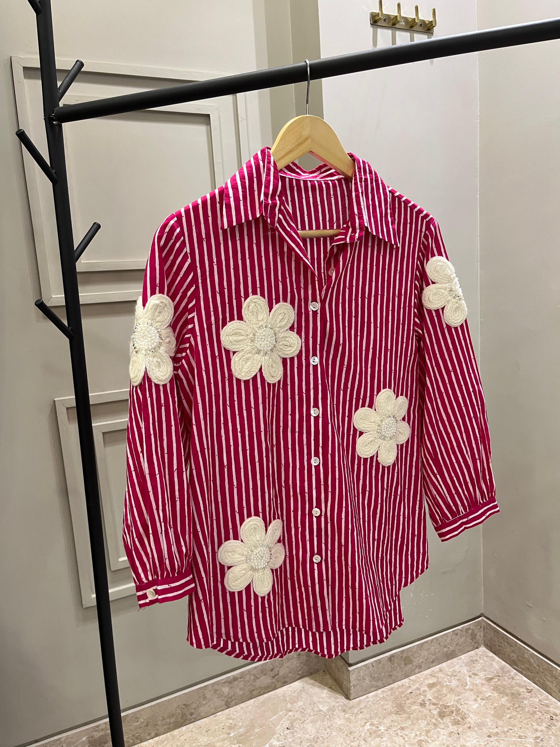 Playful yet polished, this Pink Organic Cotton Striped Shirt brings a hint of artistry to your everyday style. The floral crochet patches add a delicate handcrafted touch, beautifully complementing the soft pink and white striped pattern. Made from pure organic cotton, it offers unmatched comfort while keeping your look breezy and sophisticated—ideal for days when you want to look effortlessly chic.