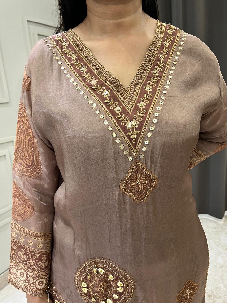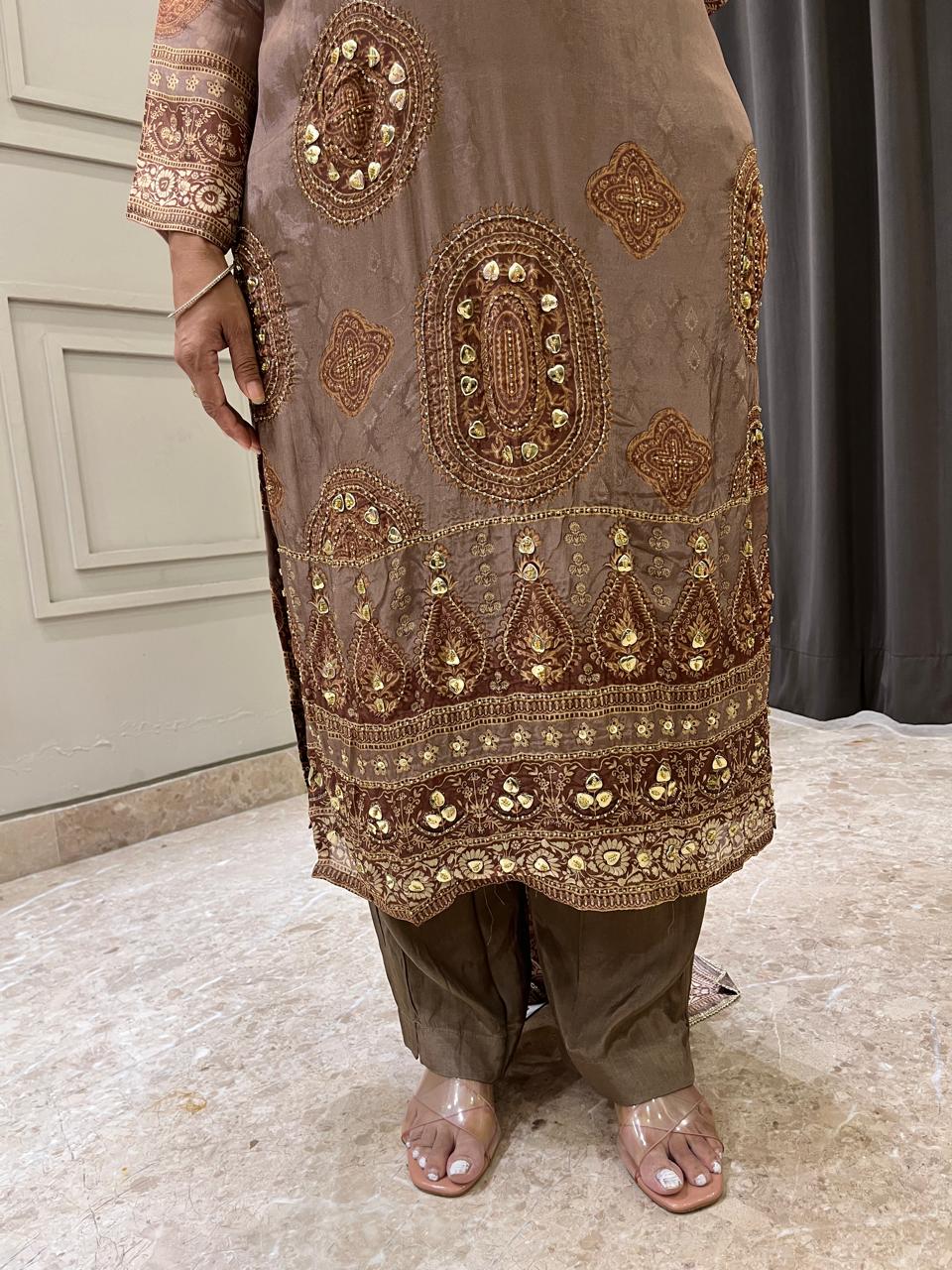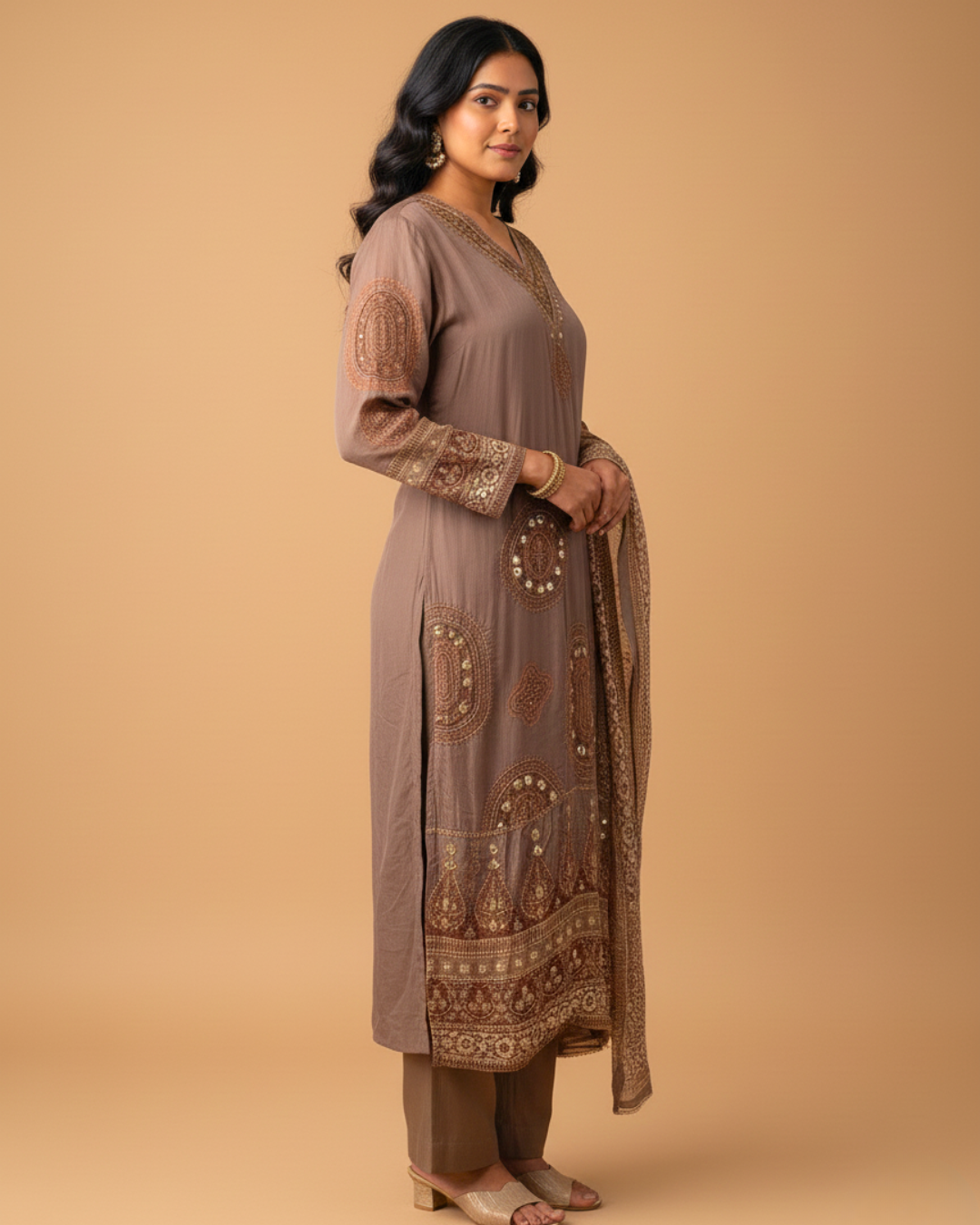 Exude understated elegance with this formal 3-piece suit in a versatile brown beige hue. Crafted for both style and comfort, this ready-to-wear ensemble features a refined silhouette and smooth fabric that drapes beautifully, making it perfect for formal gatherings, office events, or evening occasions.