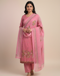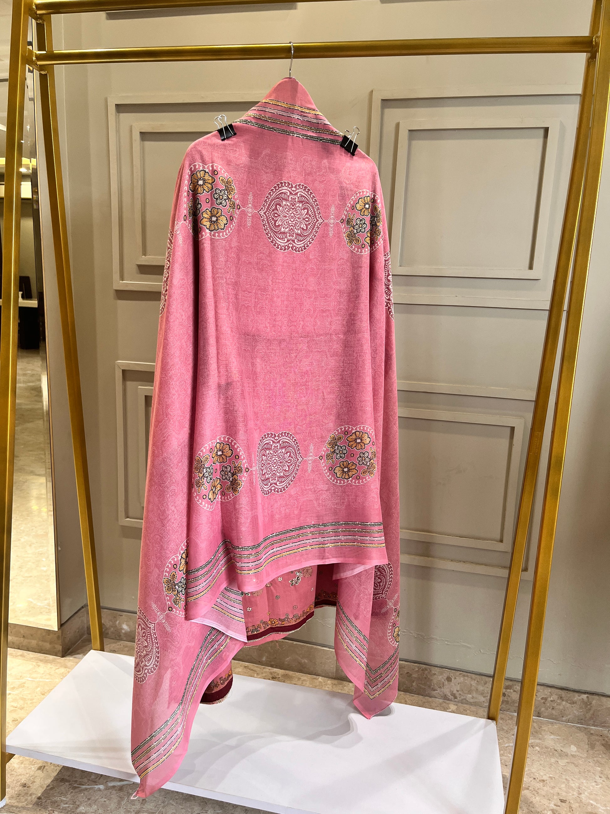 Infuse freshness into your wardrobe with this carrot pink unstitched suit, crafted from pure cotton for all-day comfort. The shirt features delicate thread work on the front and back, paired with a plain matching lower and a beautiful printed dupatta that adds a pop of elegance. Perfect for everyday grace or casual gatherings.