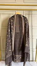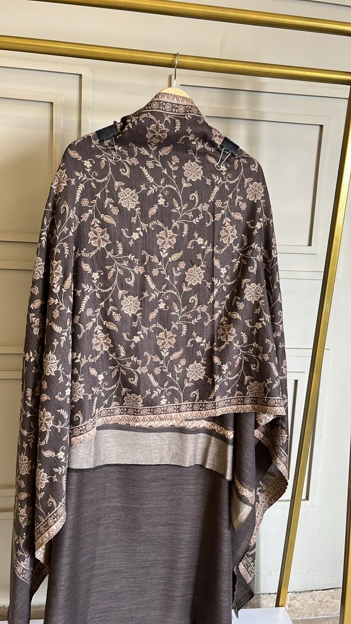 The set is paired with a plain unstitched lower in matching coffee colour, ensuring a seamless and sophisticated look. Completing the ensemble is a pure pashmina dupatta, soft, warm, and gracefully draped to elevate the overall aesthetic.