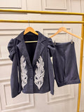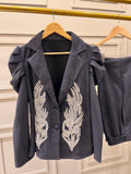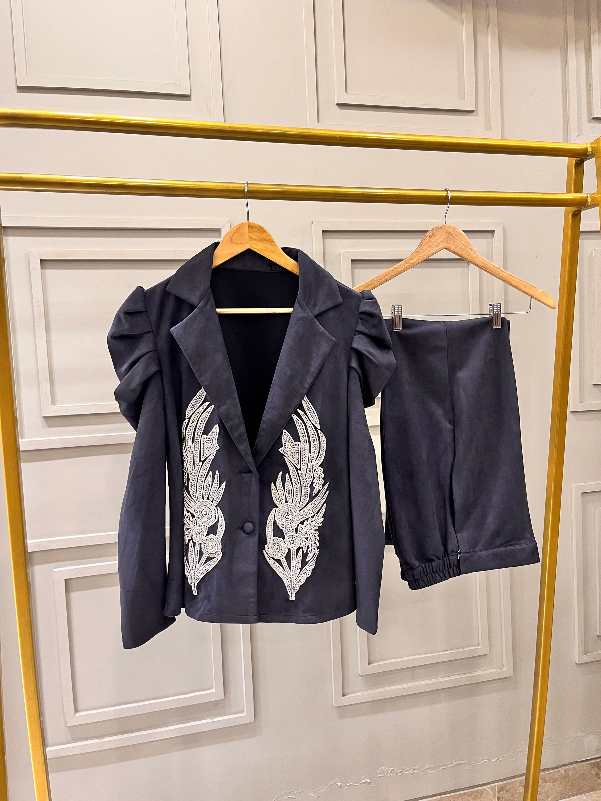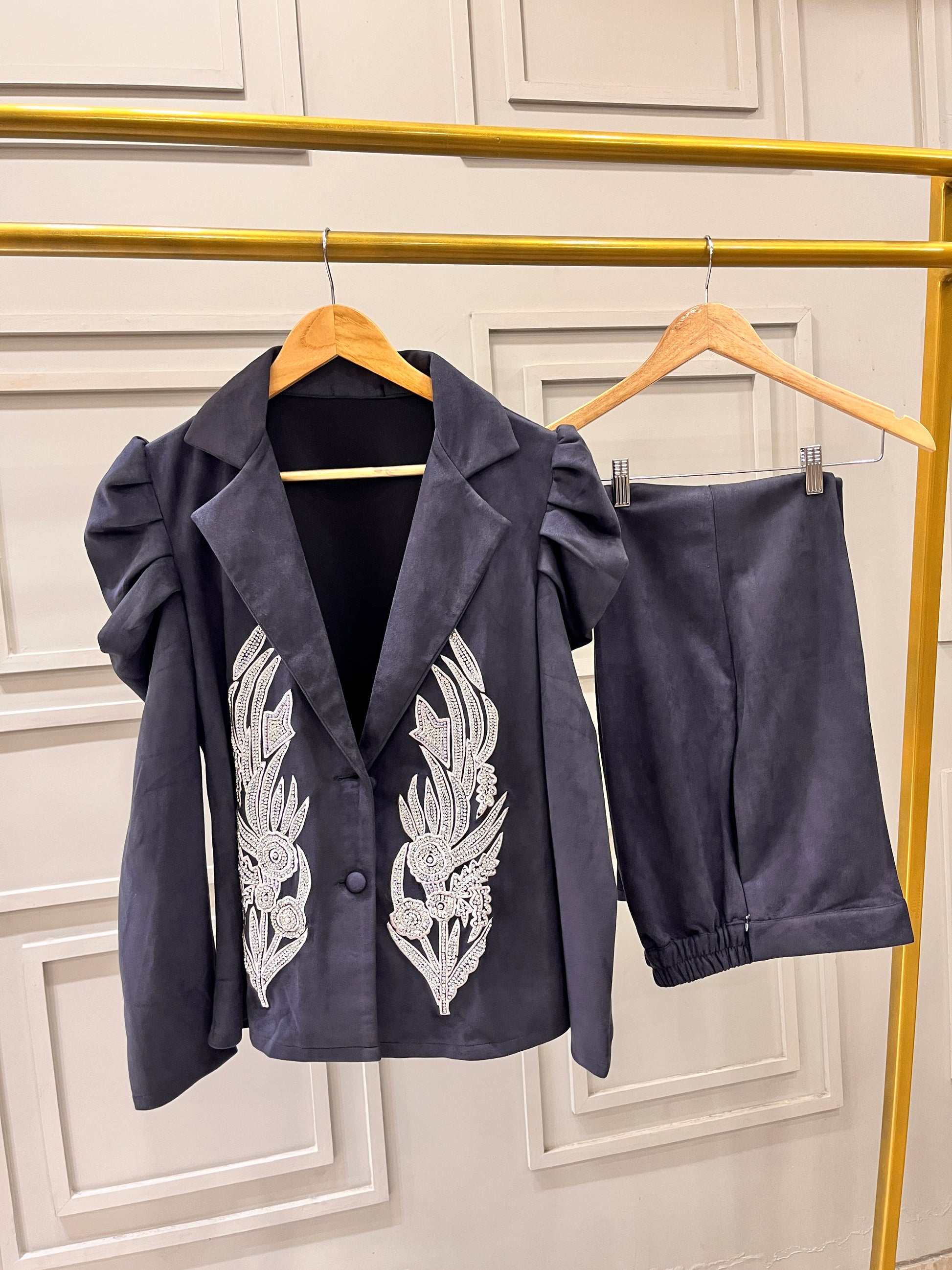 Dark Grey Suede Blazer & Pant Coord Set with Stone & Thread Work