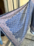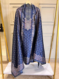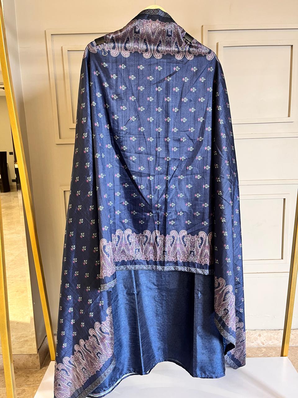A luxurious navy blue pure silk unstitched suit featuring elegant highlighting on the print all over. The rich sheen of silk enhances the intricate detailing, making it perfect for festive and formal occasions. Paired with an unstitched bottom in the same colour and a matching silk dupatta for a complete regal look.