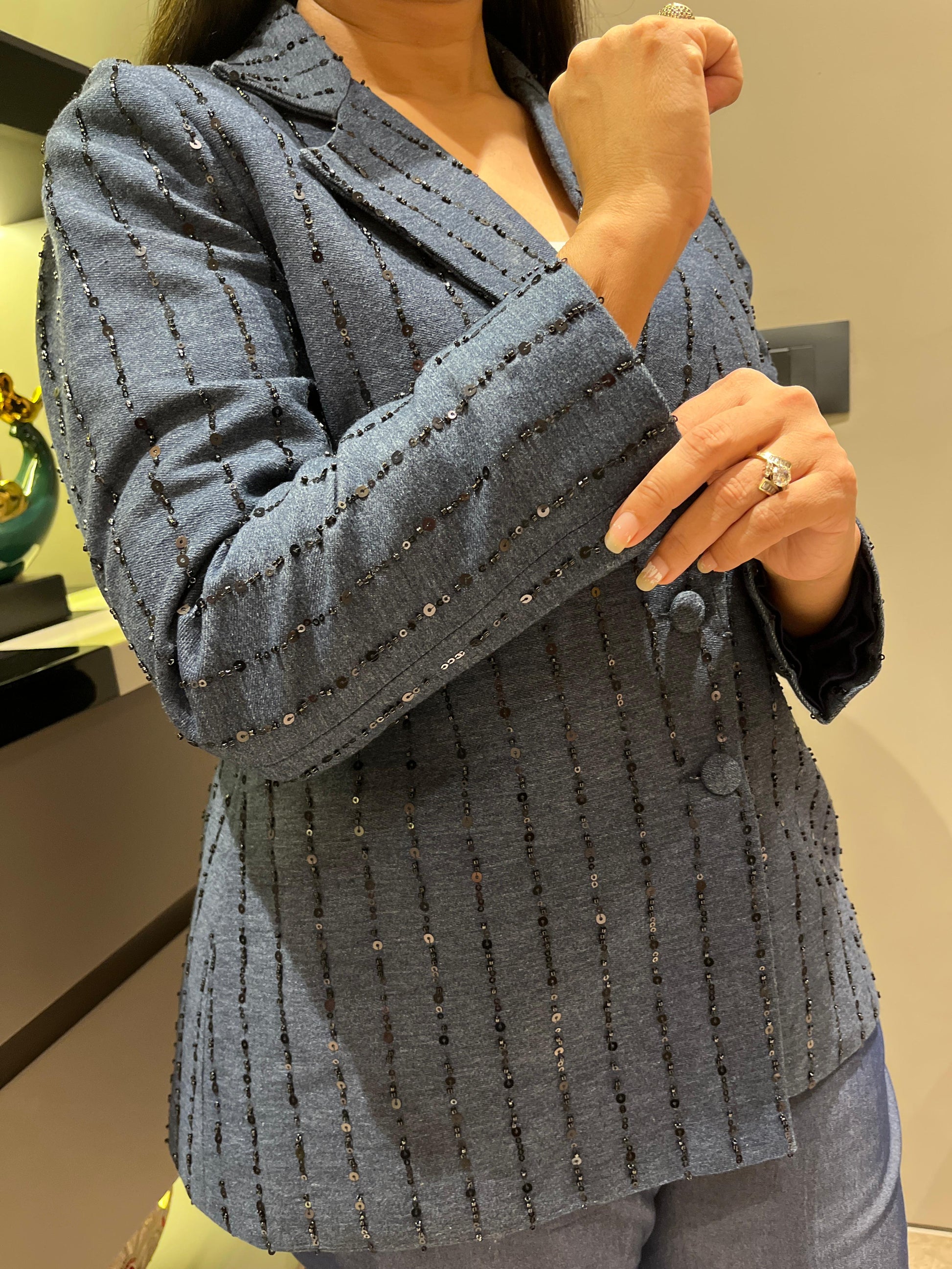 Denim Blazer with Pants – Sequin Stripe Co-ord Set