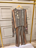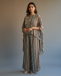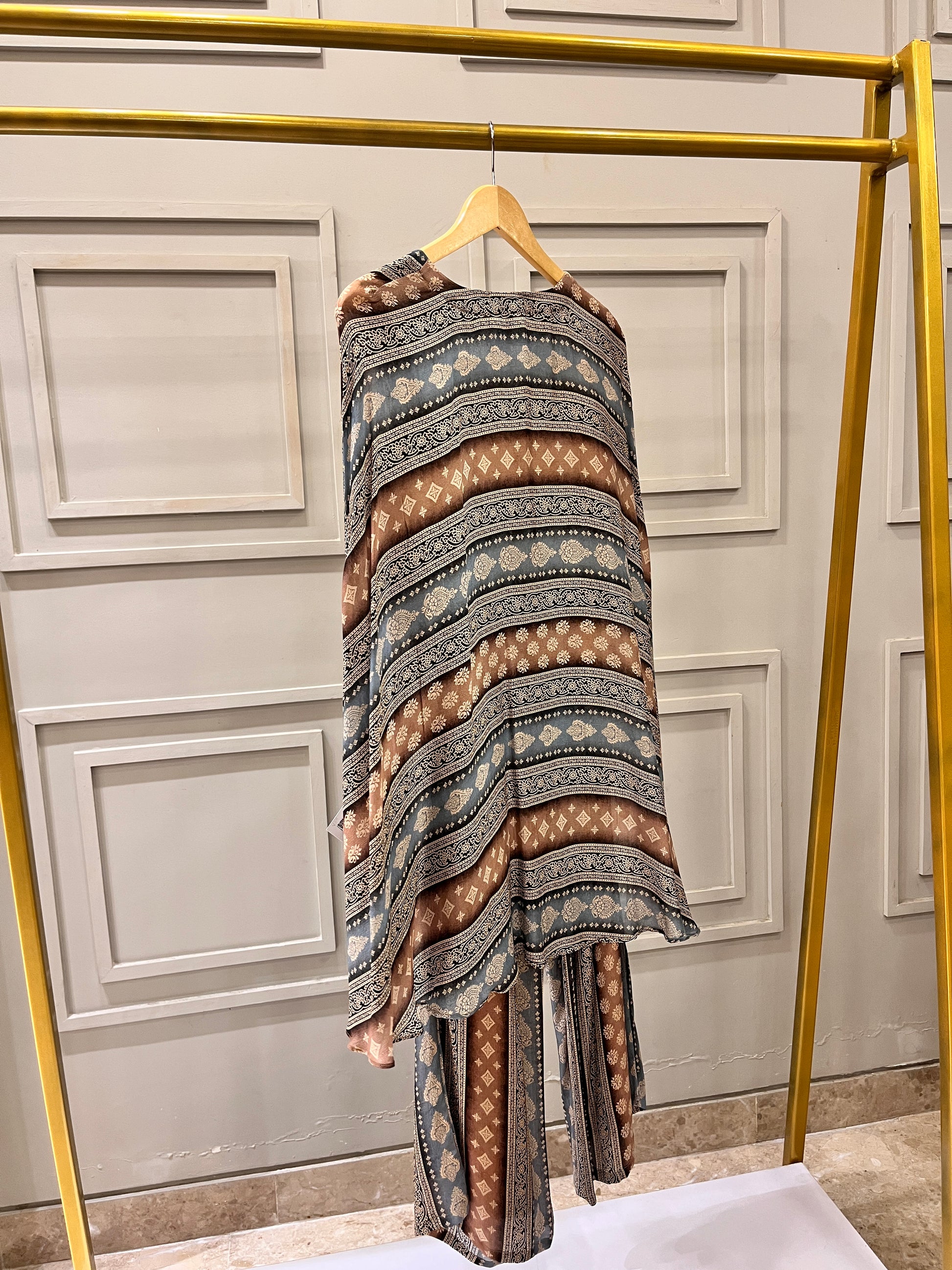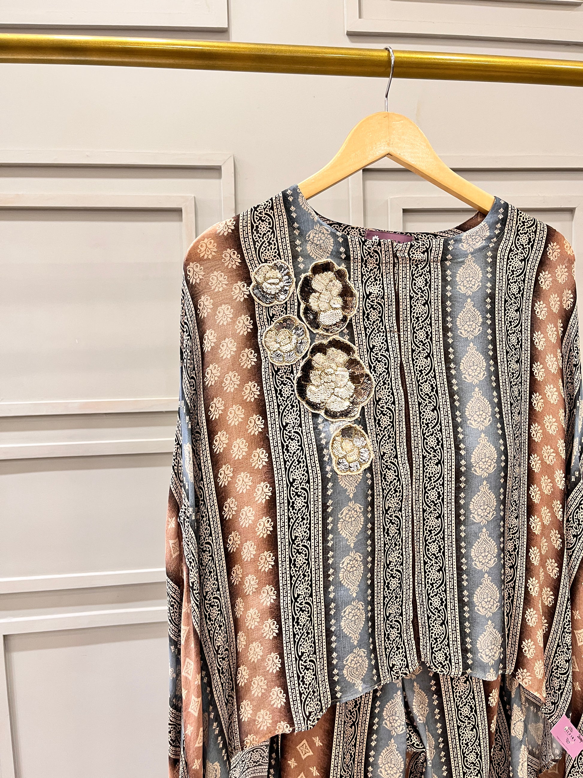 Turn heads with this elegant georgette coord set, featuring a digitally printed cape paired with a stylish bustier and pants. The look is elevated with hand-embroidered patchwork on the cape — blending comfort, luxury, and trend in one outfit. Perfect for festive occasions, brunches, or evening events where effortless glamour is key.