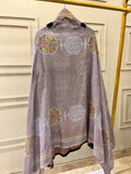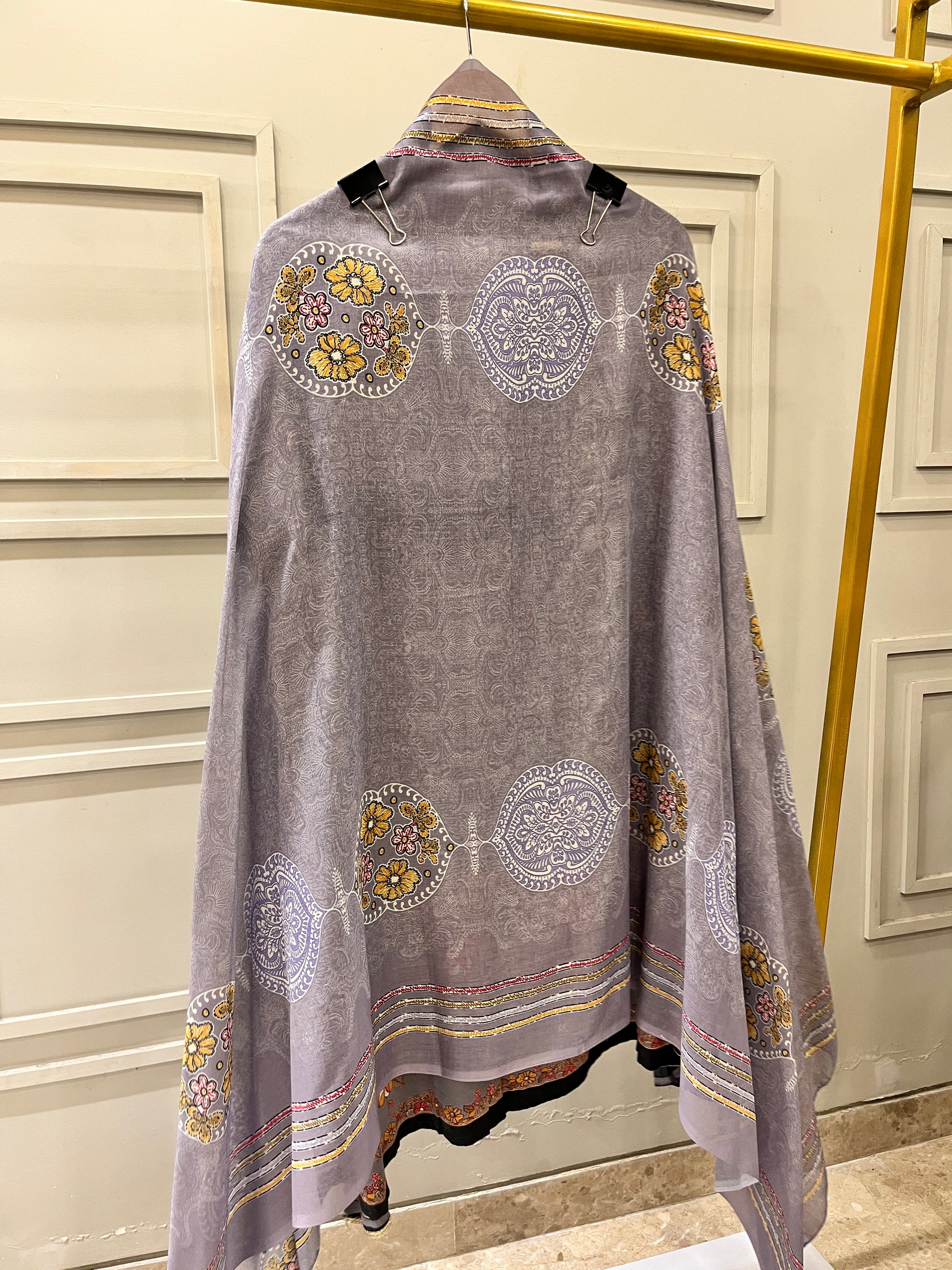Infuse freshness into your wardrobe with this Grey unstitched suit, crafted from pure cotton for all-day comfort. The shirt features delicate thread work on the front and back, paired with a plain matching lower and a beautiful printed dupatta that adds a pop of elegance. Perfect for everyday grace or casual gatherings.