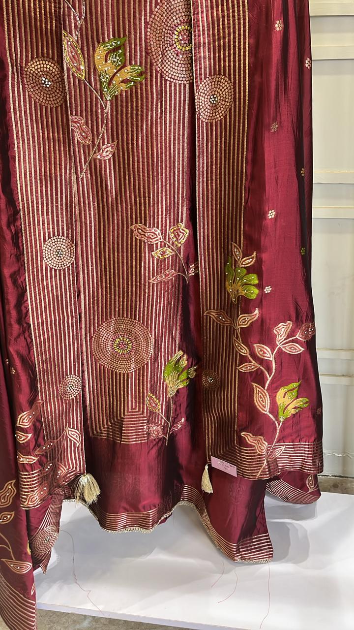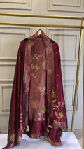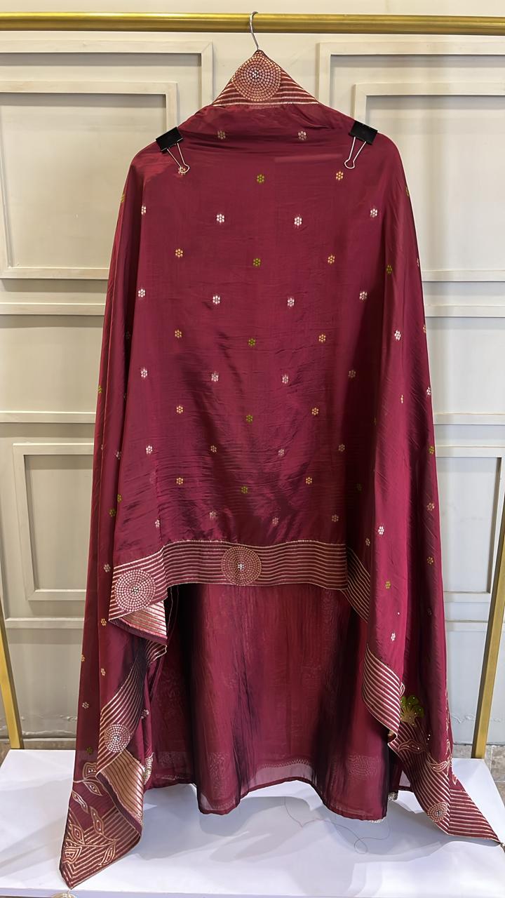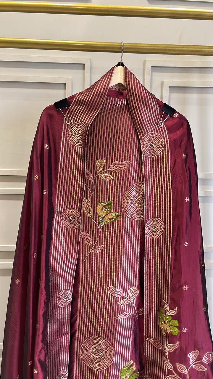 Maroon Pure Silk Unstitched Suit with Highlighted Shirt & Dupatta