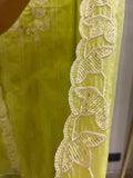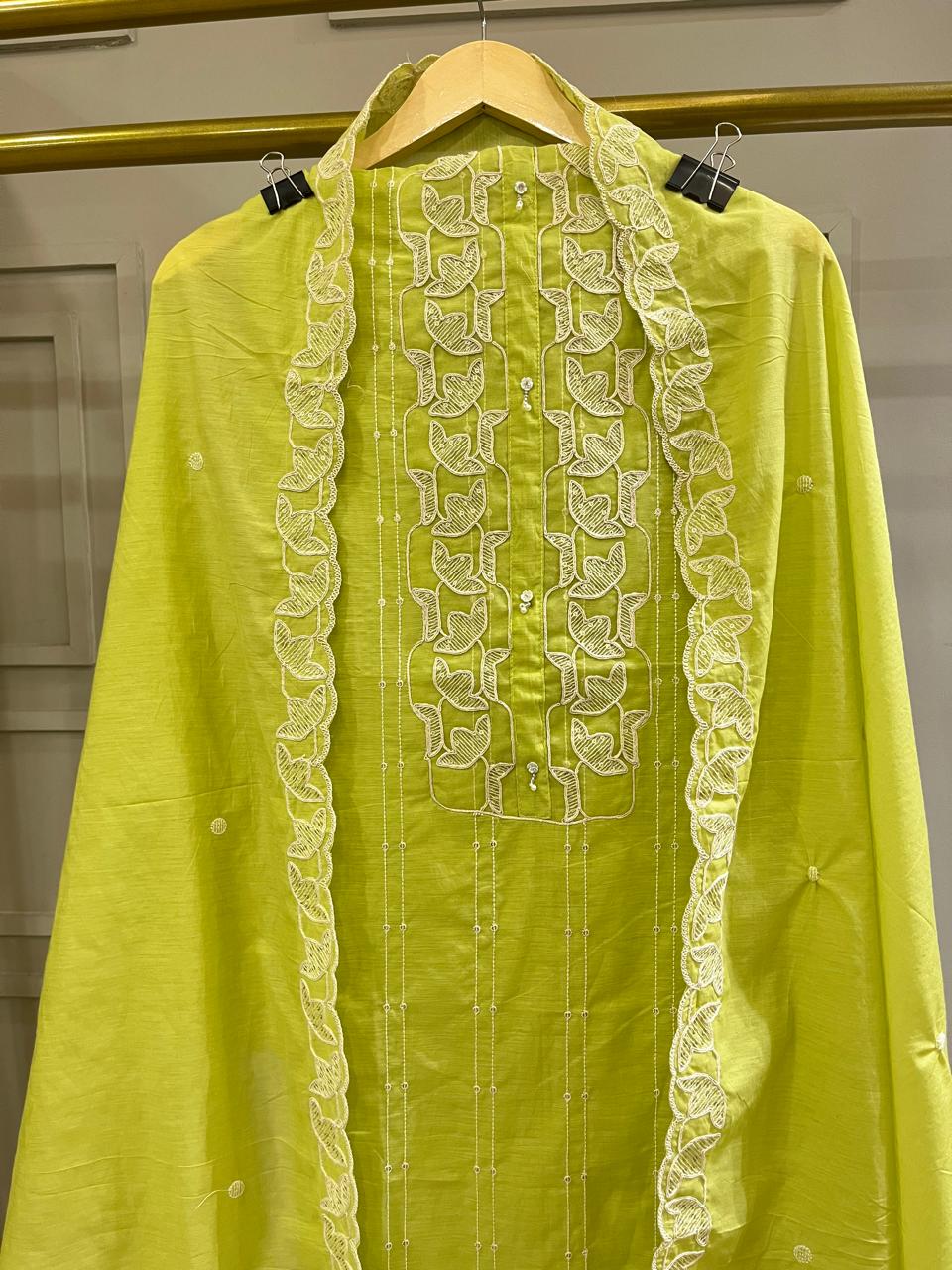 Mul Cotton Neon Green Unstitched Suit with Thread-Work & Dupatta