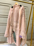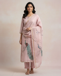 Experience timeless grace with this pure chanderi unstitched suit in a soft onion pink hue. The shirt features exquisite hand-embellished peacock detailing, paired with a printed dupatta and a matching lower in the same base color. Perfect for festive occasions or elegant daytime wear, this ensemble blends artistry with refined tradition.