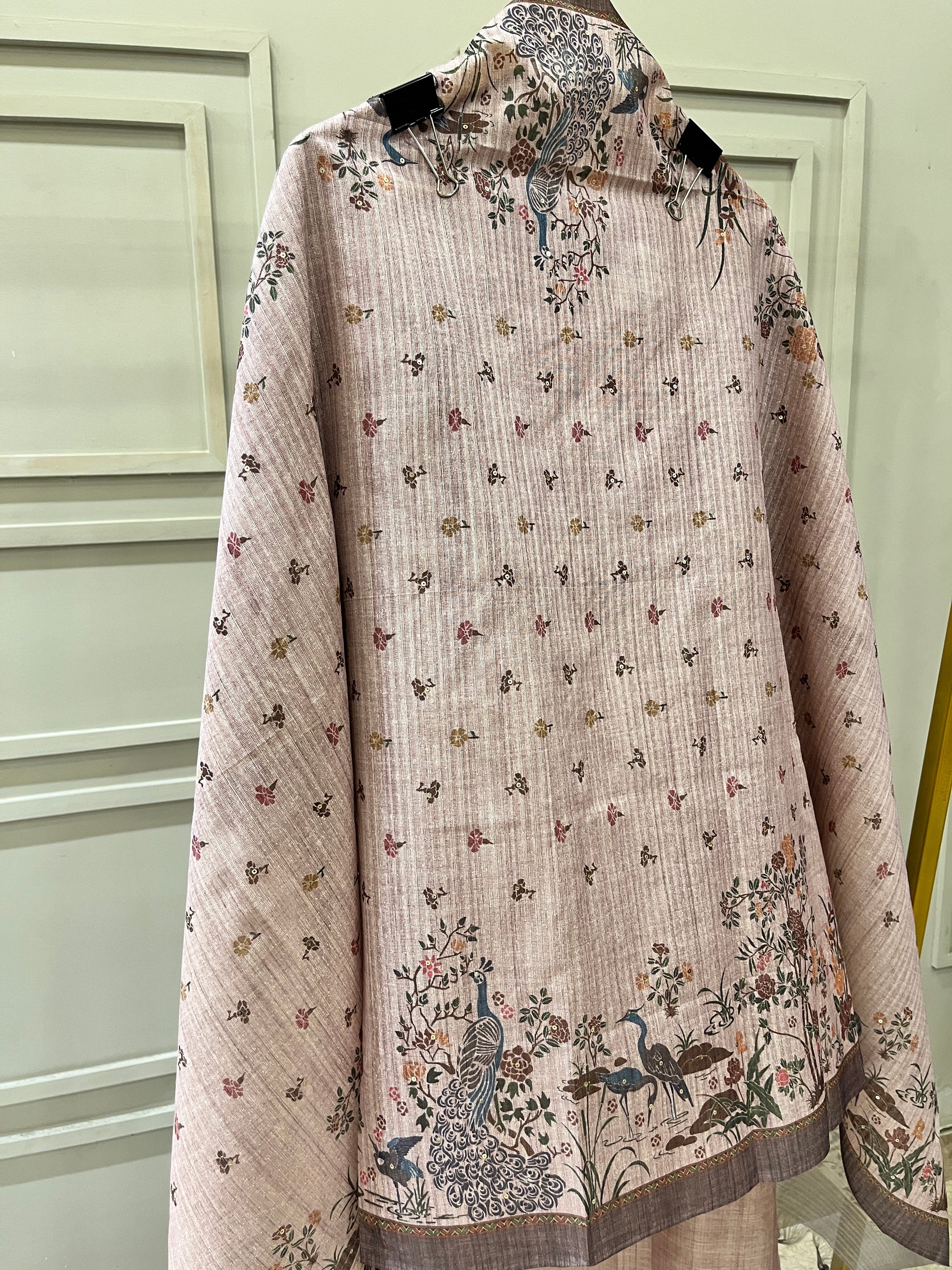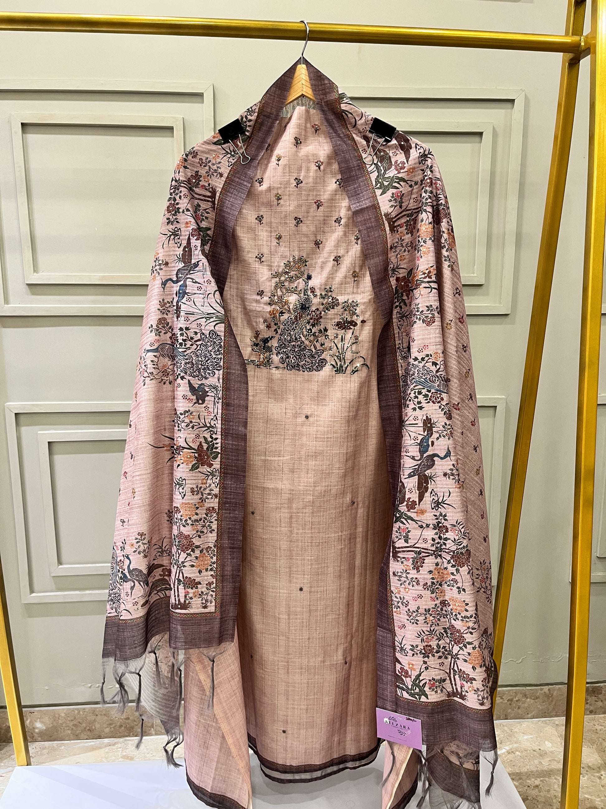Elevate your festive wardrobe with this onion pink unstitched suit crafted from pure chanderi fabric. The shirt features a graceful peacock print on the front, paired with a printed dupatta and a matching lower in the same base color. Perfect for festive gatherings or casual celebrations, this suit combines artistry and elegance effortlessly.