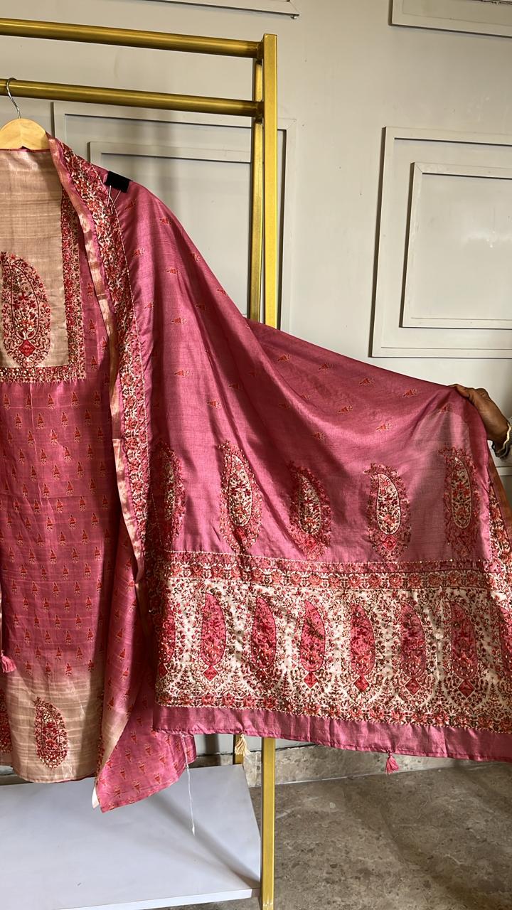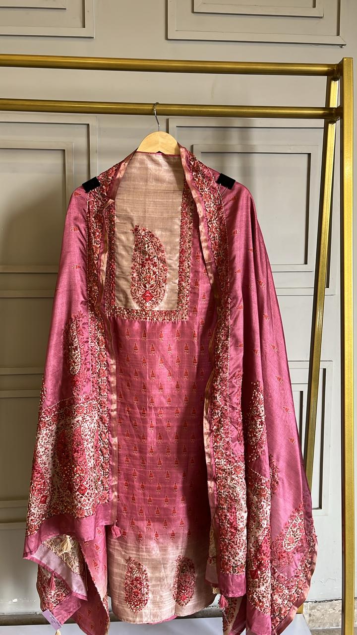 Onion Pink Pure Silk Unstitched Suit with Kantha Work