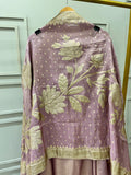 Indulge in timeless elegance with this onion pink semi-stitched suit crafted from luxurious shimmer tissue fabric. The shirt features exquisite golden patchwork and delicate thread embroidery, beautifully accentuated with an embroidered kurta patti for a refined finish. Paired with a rich Banarasi dupatta and a matching lower, this ensemble exudes regal charm — perfect for festive occasions, weddings, and evening celebrations.