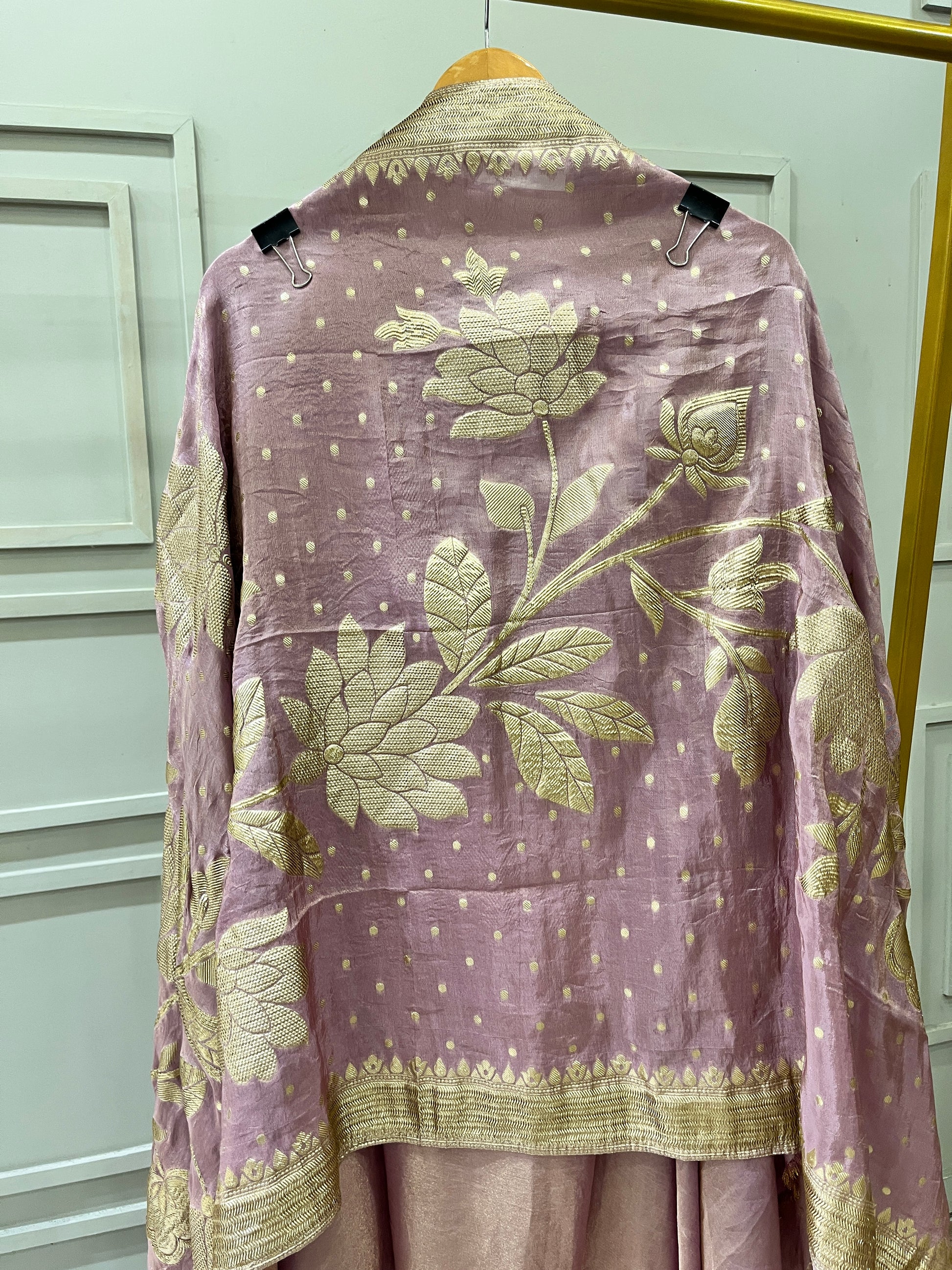 Onion Pink Shimmer Tissue Semi-Stitched Suit with Banarasi Dupatta