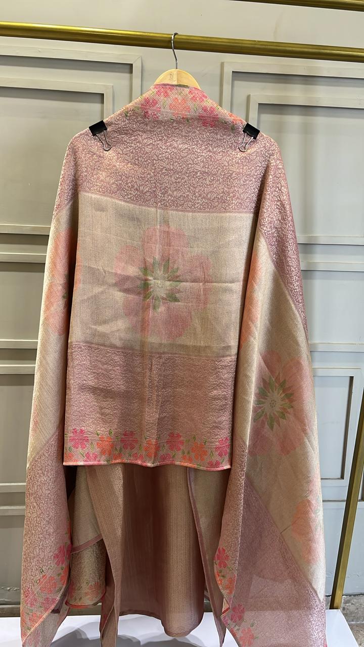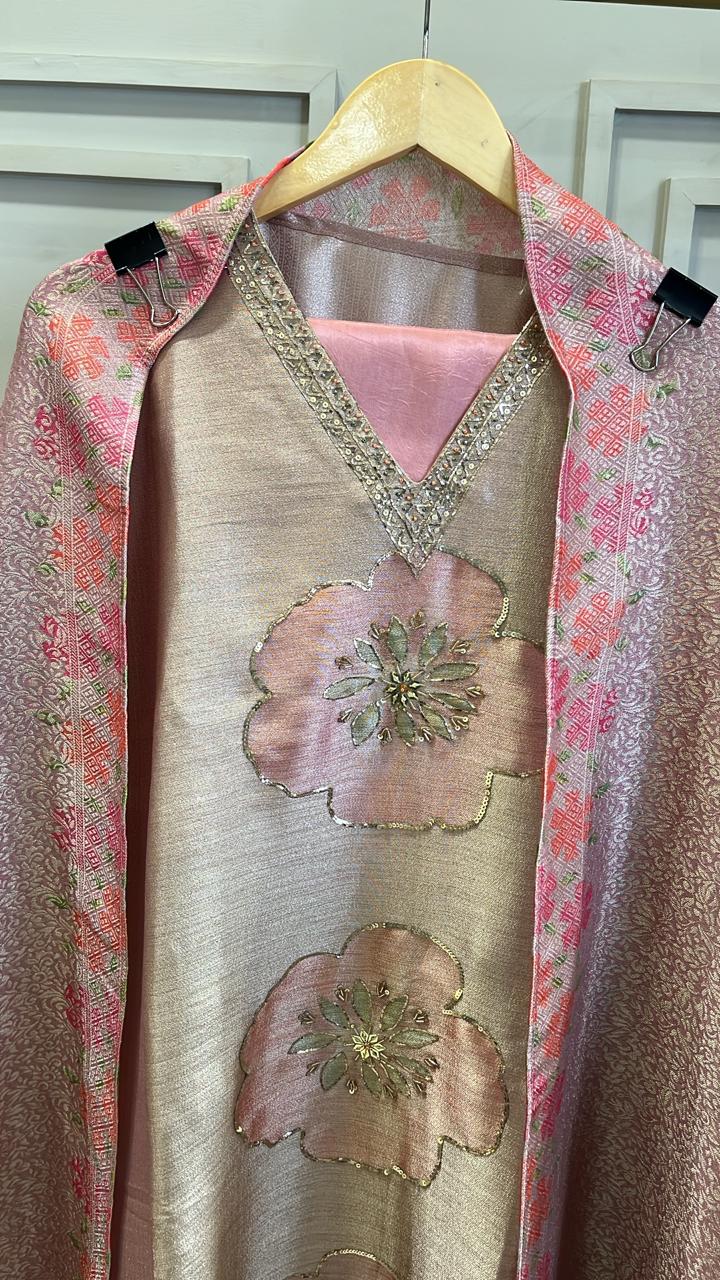 Pastel Pink Brocade Tissue Unstitched Suit with Highlighted Shirt & Digital Floral Dupatta