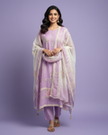 This elegant suit is crafted from pure mul cotton, offering unbeatable comfort and breathability. The soft pastel mauve hue exudes quiet charm, while delicate embroidery adds refined detail. The set includes an unstitched lower in the matching base colour of the shirt, along with a beautifully printed dupatta that completes the look.