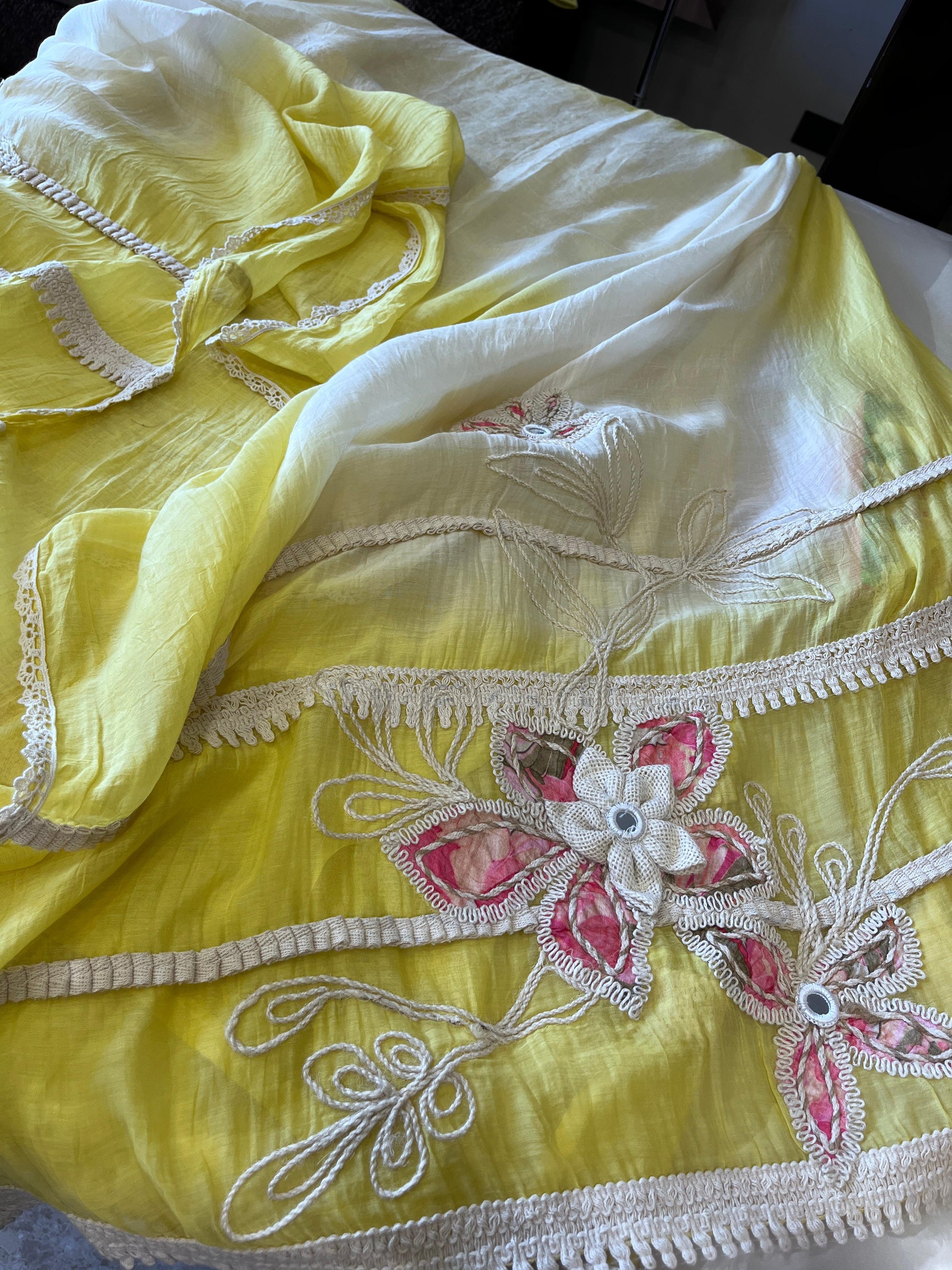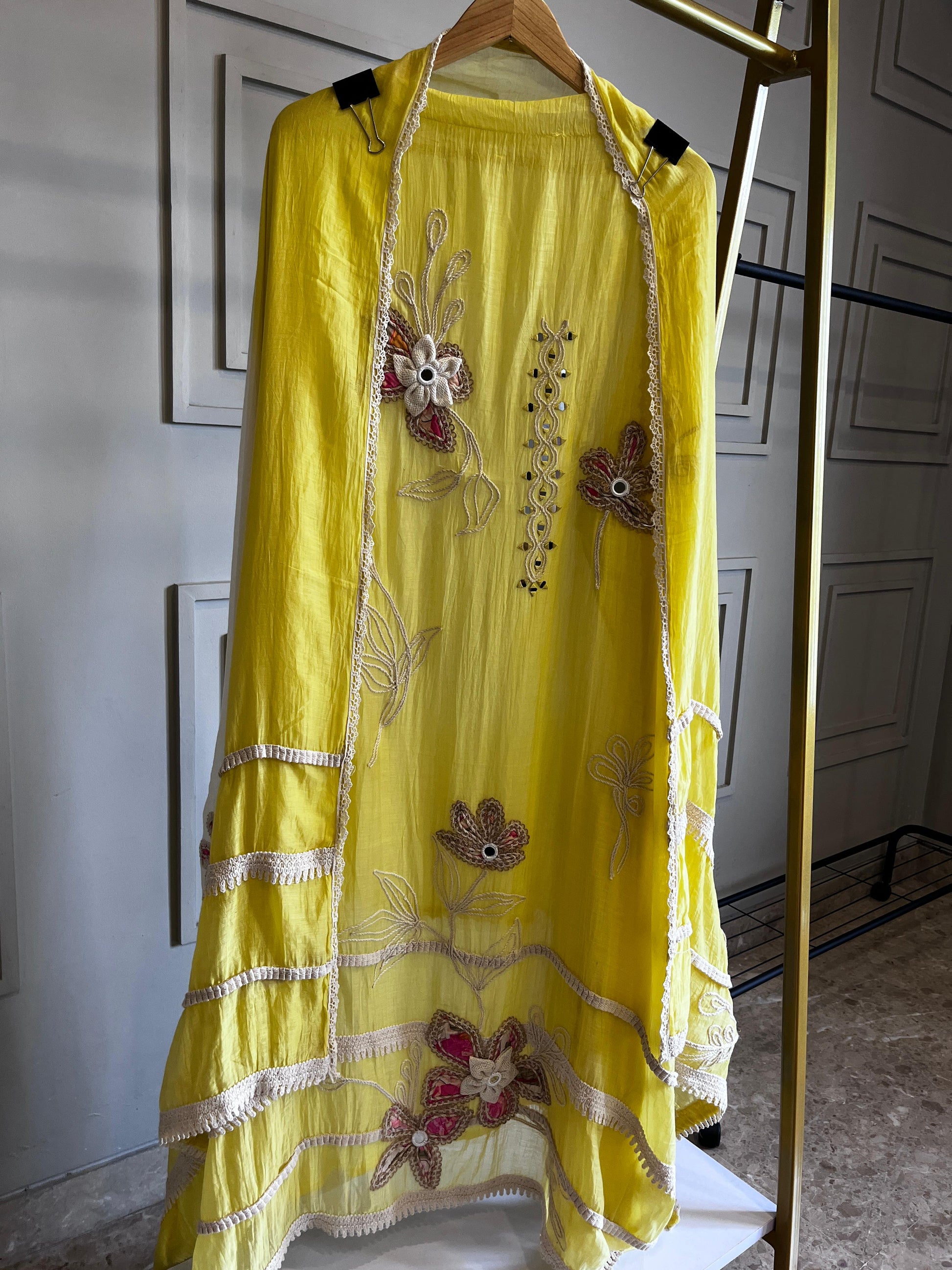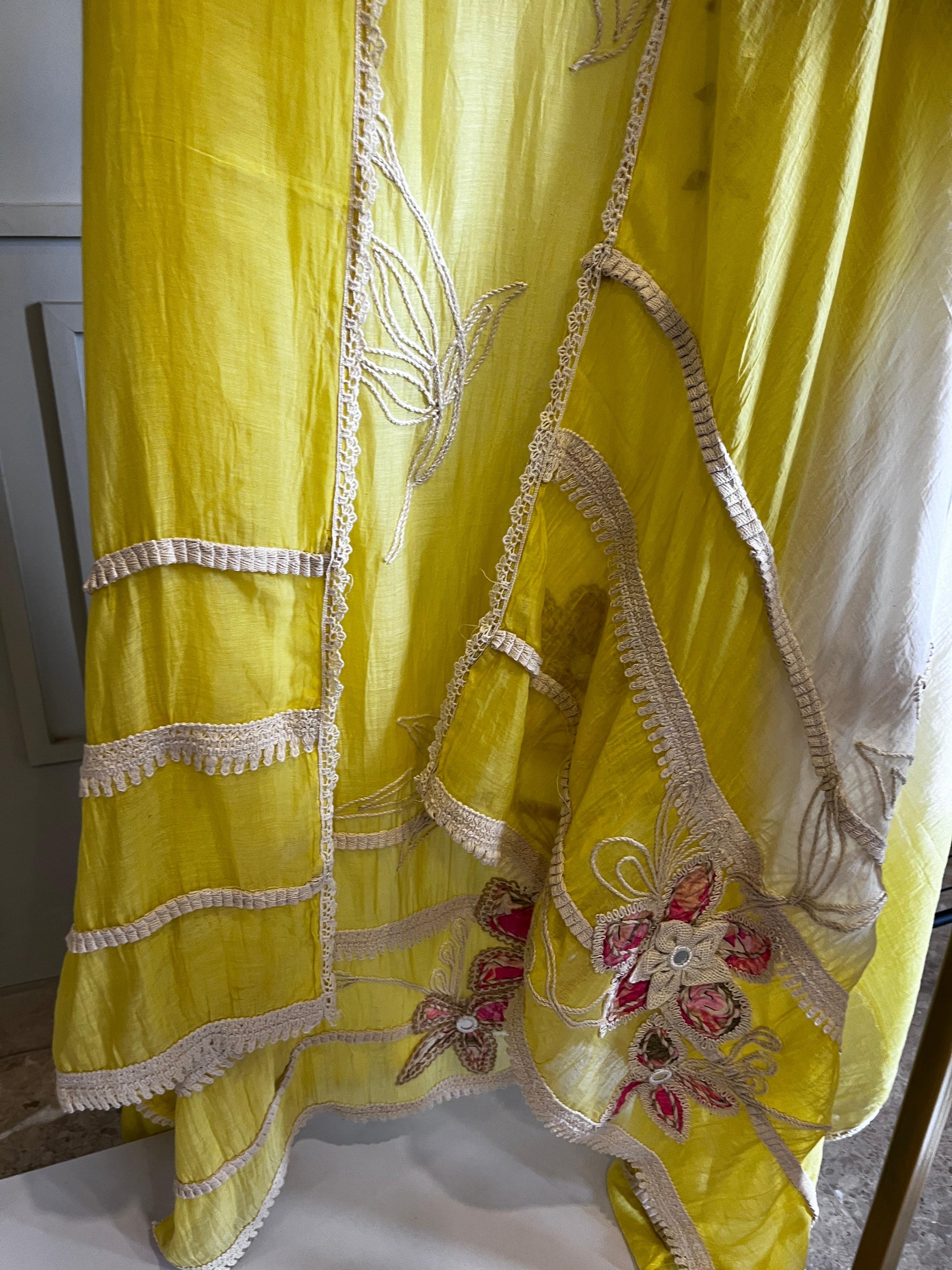 This elegant suit is crafted from pure mul cotton, offering unmatched comfort and breathability. The soft pastel yellow fabric is beautifully adorned with intricate floral embroidery and delicate lace trimming. The set includes an unstitched bottom in the same base colour as the shirt, and a beautifully coordinated mul cotton dupatta with elaborate floral embroidery and dori work.