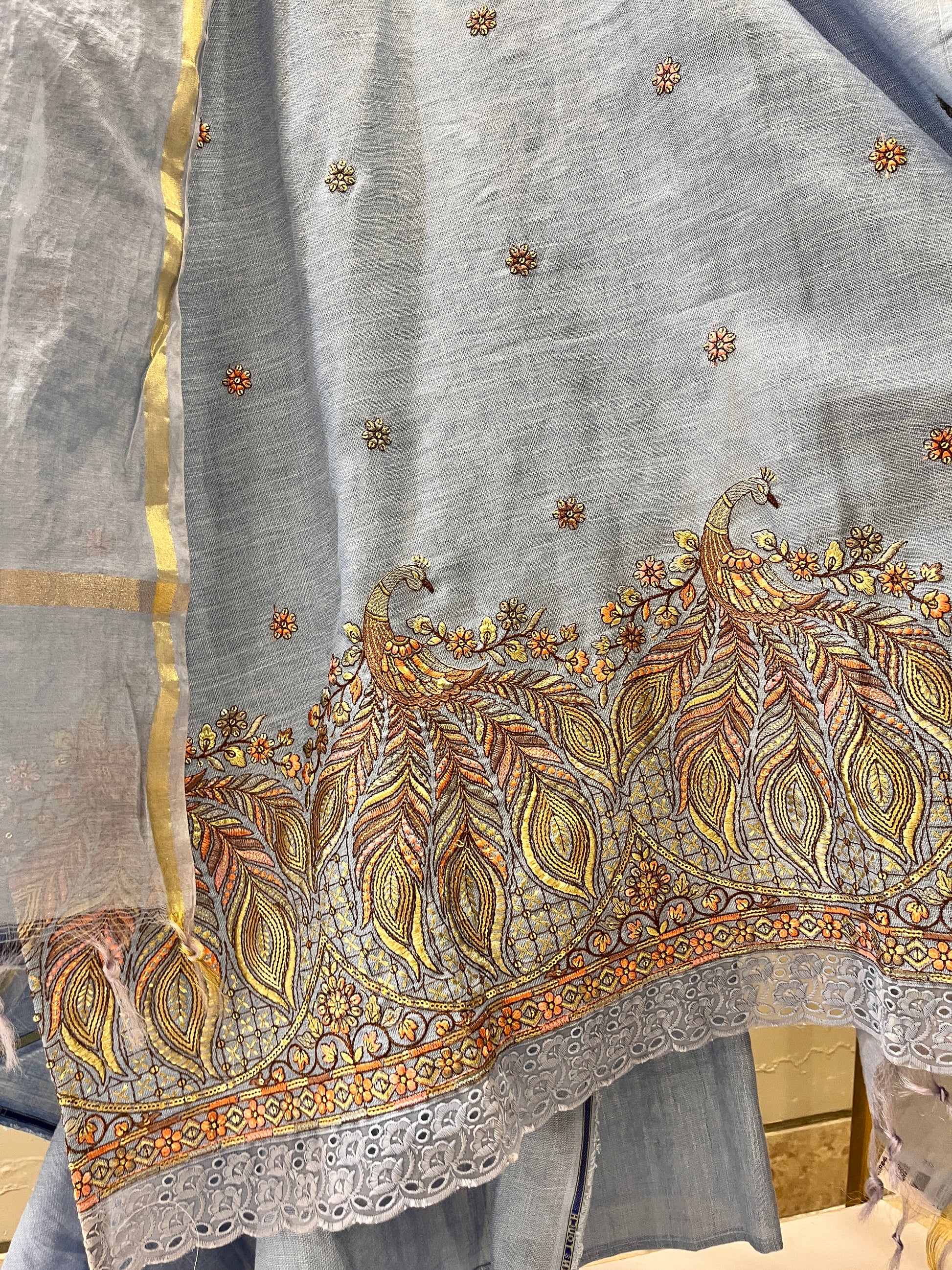 Step into effortless sophistication with this powder blue semi-stitched suit, crafted from pure linen fabric for a breathable, elegant drape. The shirt features intricate hand embroidery on the front, beautifully enhanced with delicate tassels on the kurta patti, adding a touch of artisanal charm. Paired with a coordinating pure linen dupatta and matching lower, this ensemble blends comfort and style — perfect for daytime celebrations or elegant casual wear.
