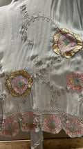 An elegant vision in soft powder blue, this semi-stitched suit is crafted from luxurious pure soft organza, featuring refined detailing on the shirt’s front and delicately highlighted borders with thread work. The set includes an unstitched bottom in the same base colour and a graceful dupatta in soft organza with detailed thread work all over.