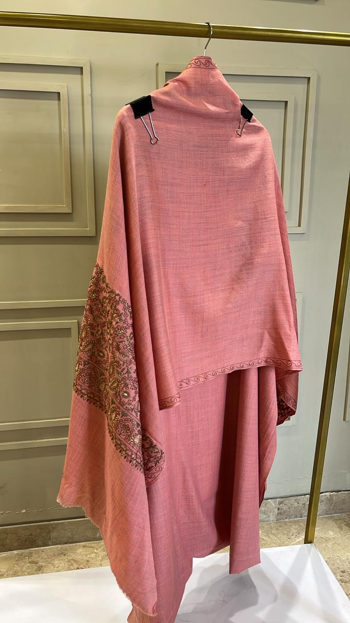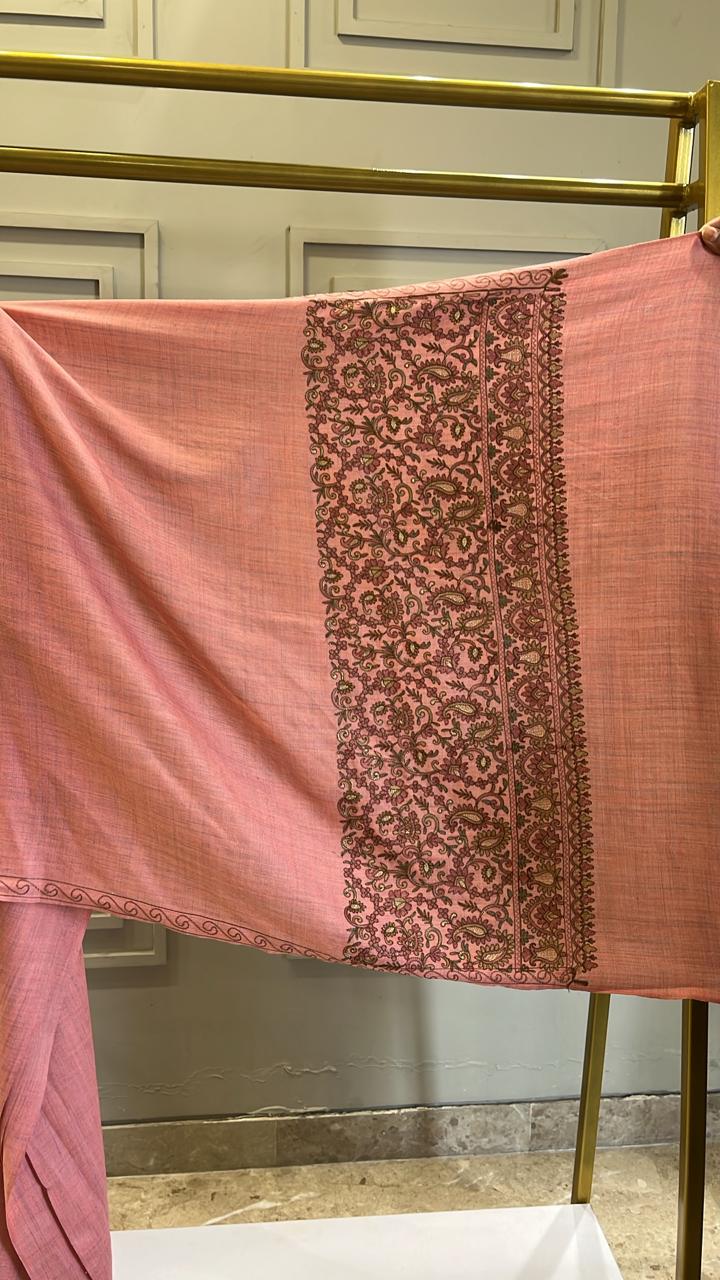 The carrot pink unstitched pashmina shirt features beautiful thread embroidery, adding a refined, handcrafted charm to the ensemble. It comes with a pure pashmina plain lower in a matching shade for a seamless, coordinated look. Completing the set is a pure pashmina dupatta, adorned with delicate thread embroidery that enhances its graceful appeal.