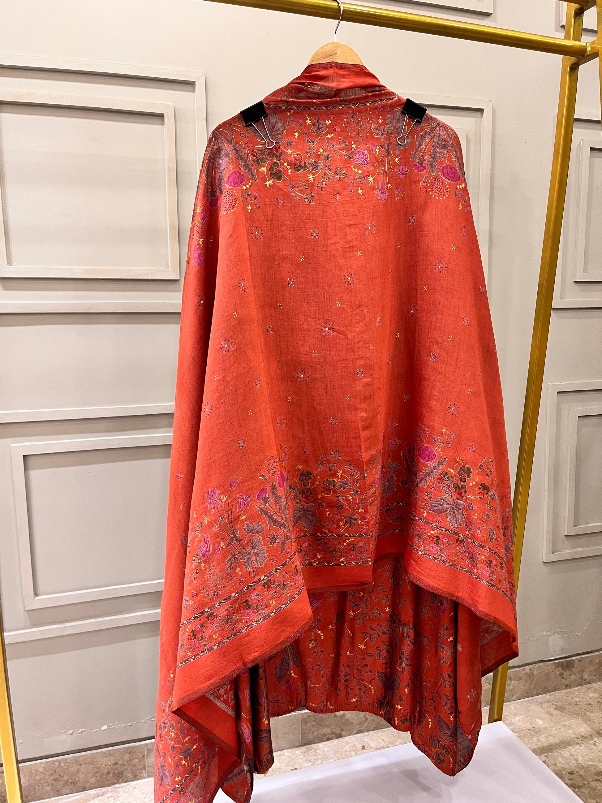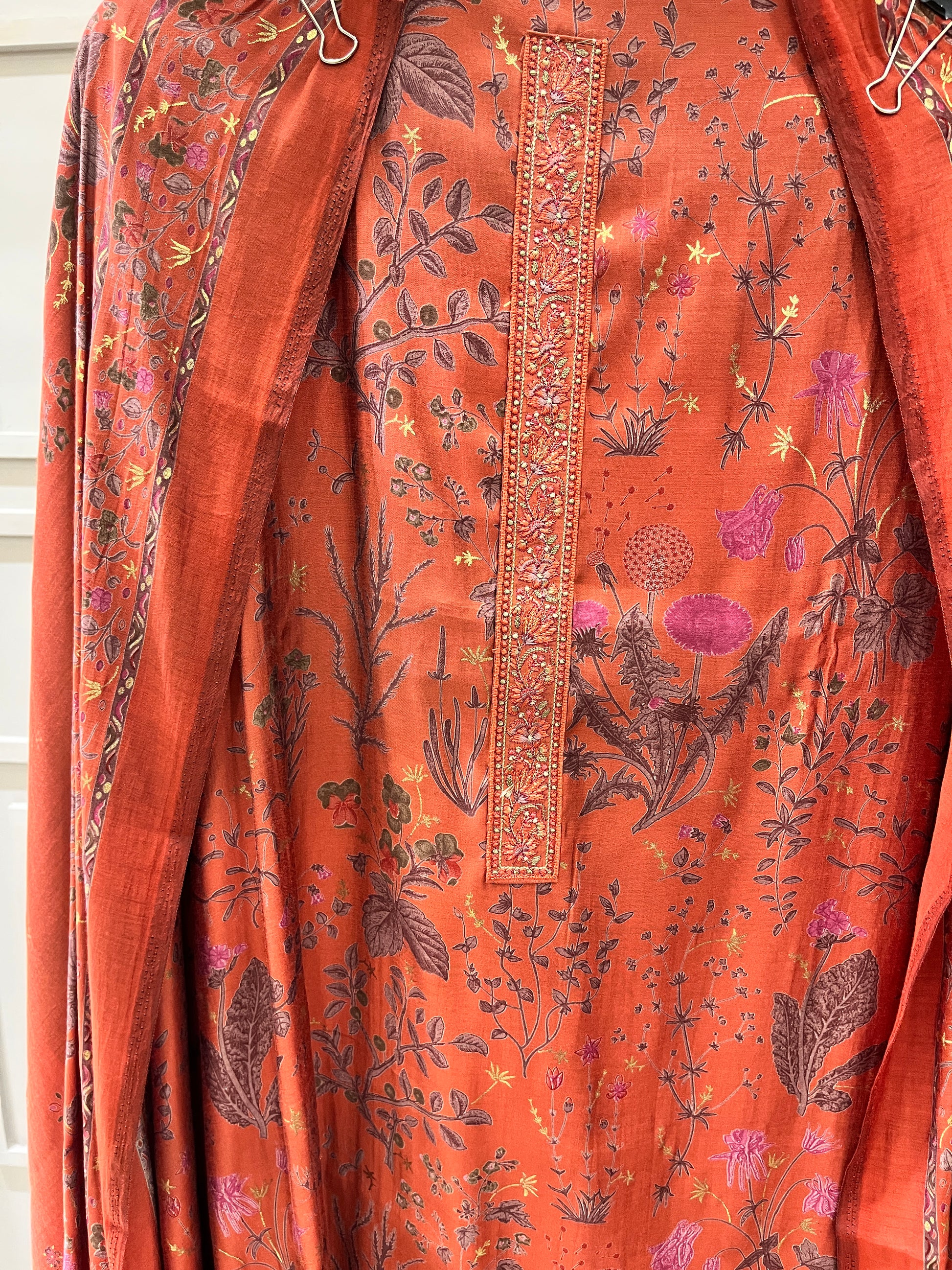 Add a touch of earthy elegance to your collection with this rust-colored unstitched suit crafted from soft modal cotton fabric. The breathable texture ensures all-day comfort, while the printed dupatta adds a vibrant contrast. Paired with a matching lower in the same base color, this ensemble is perfect for casual outings or subtle festive wear.