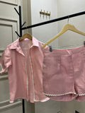 Stay cool and chic in this soft pink linen coord set, featuring a relaxed-fit shirt with white scallop detailing and matching high-waist shorts.