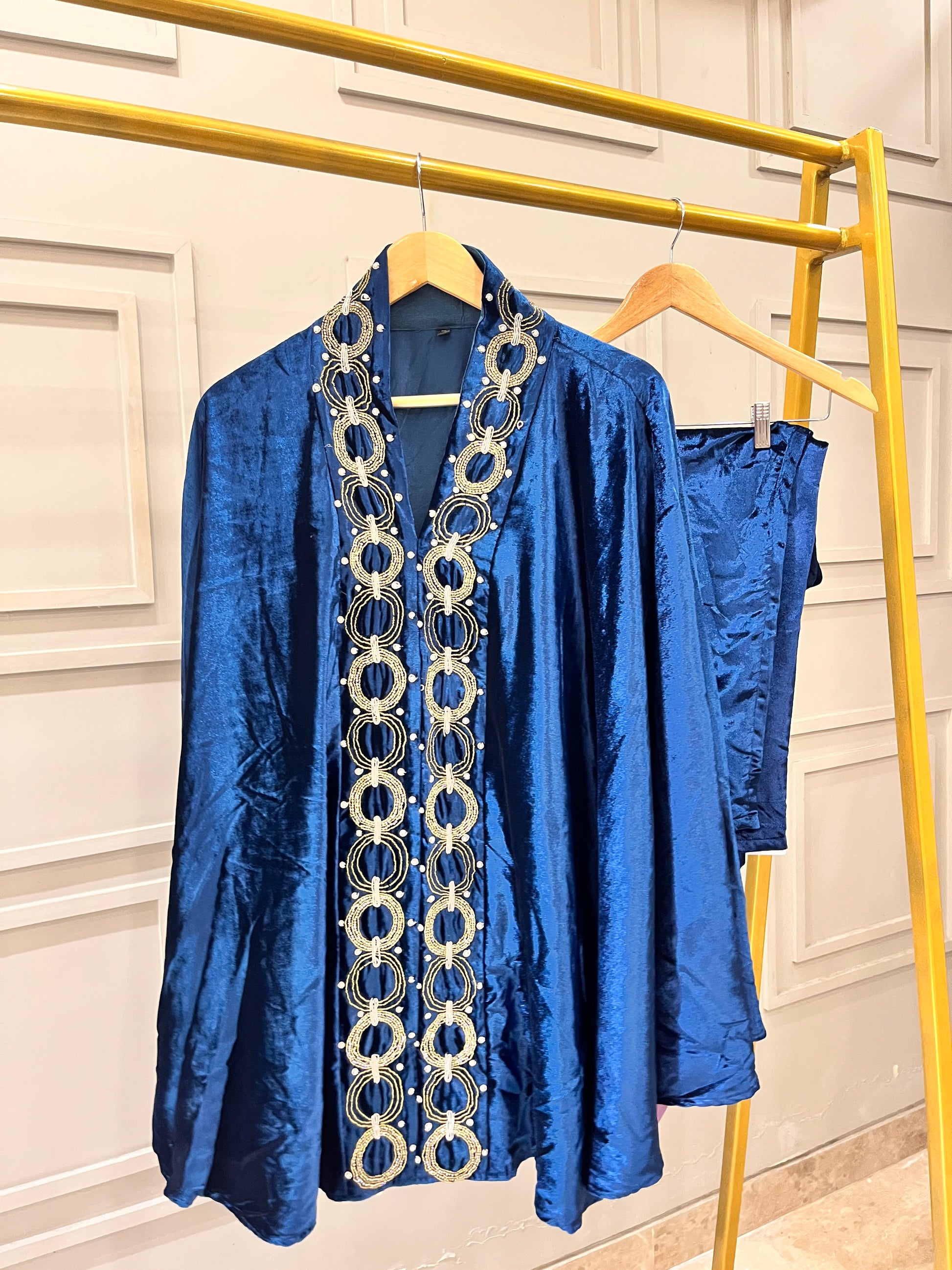 Radiate sophistication with this luxurious teal blue velvet coord set, crafted for statement elegance. The velvet cape features exquisite handwork on the front and back neck collar, adding a refined touch to your festive or evening look. Paired with plain velvet lowers, this ensemble blends comfort with royal charm — perfect for celebrations and special occasions.